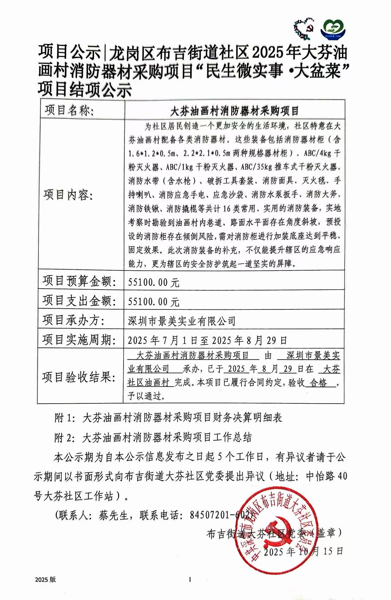 项目公示|龙岗区布吉街道大芬社区2025年大芬油画村消防器材采购项目“民生微实事·大盆菜”项目结项公示