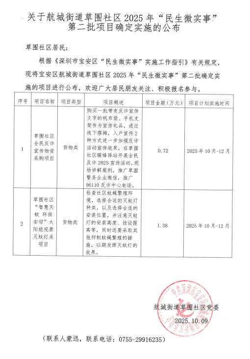 项目公示|宝安区航城街道草围社区2025年“民生微实事”第二批项目确定实施的公布