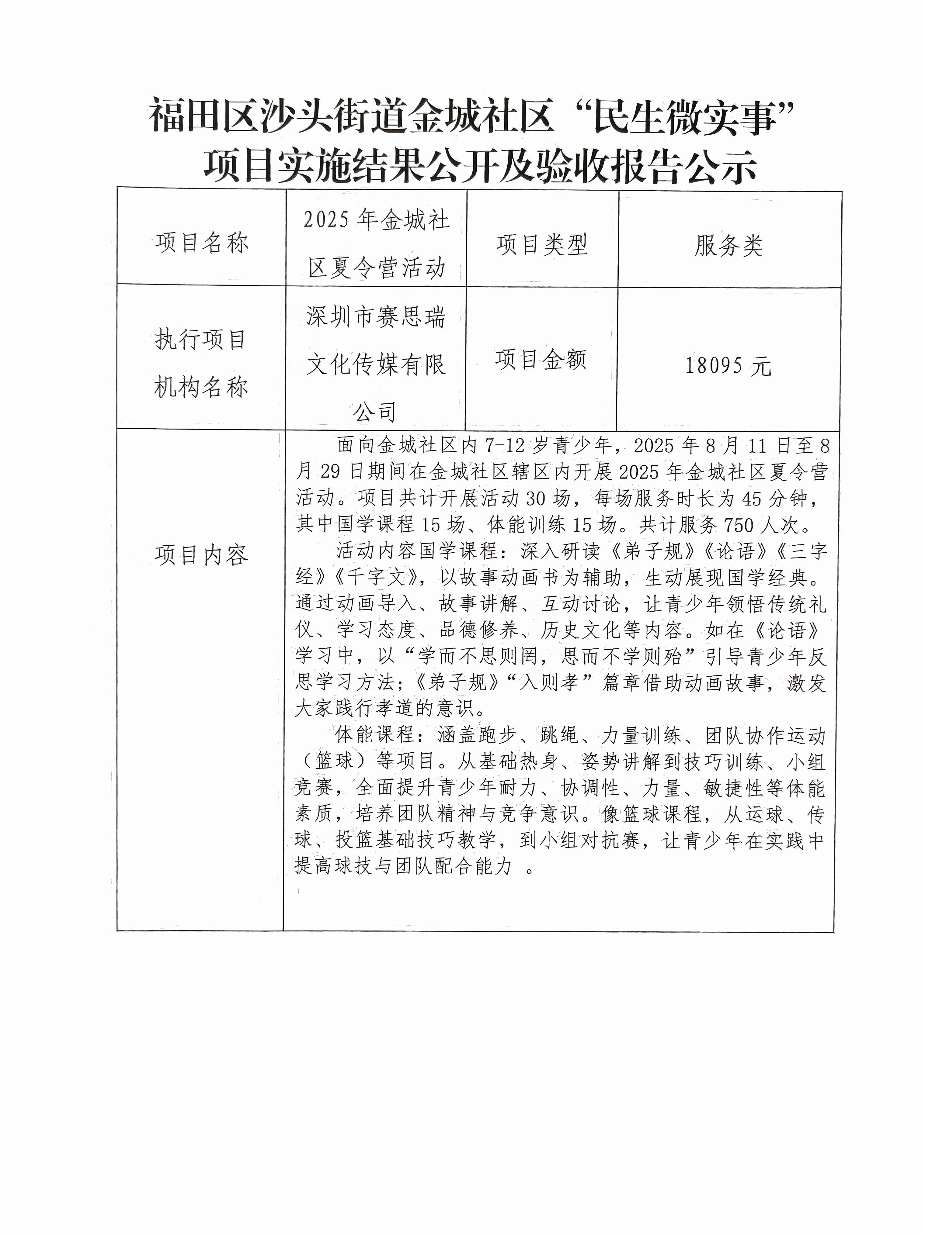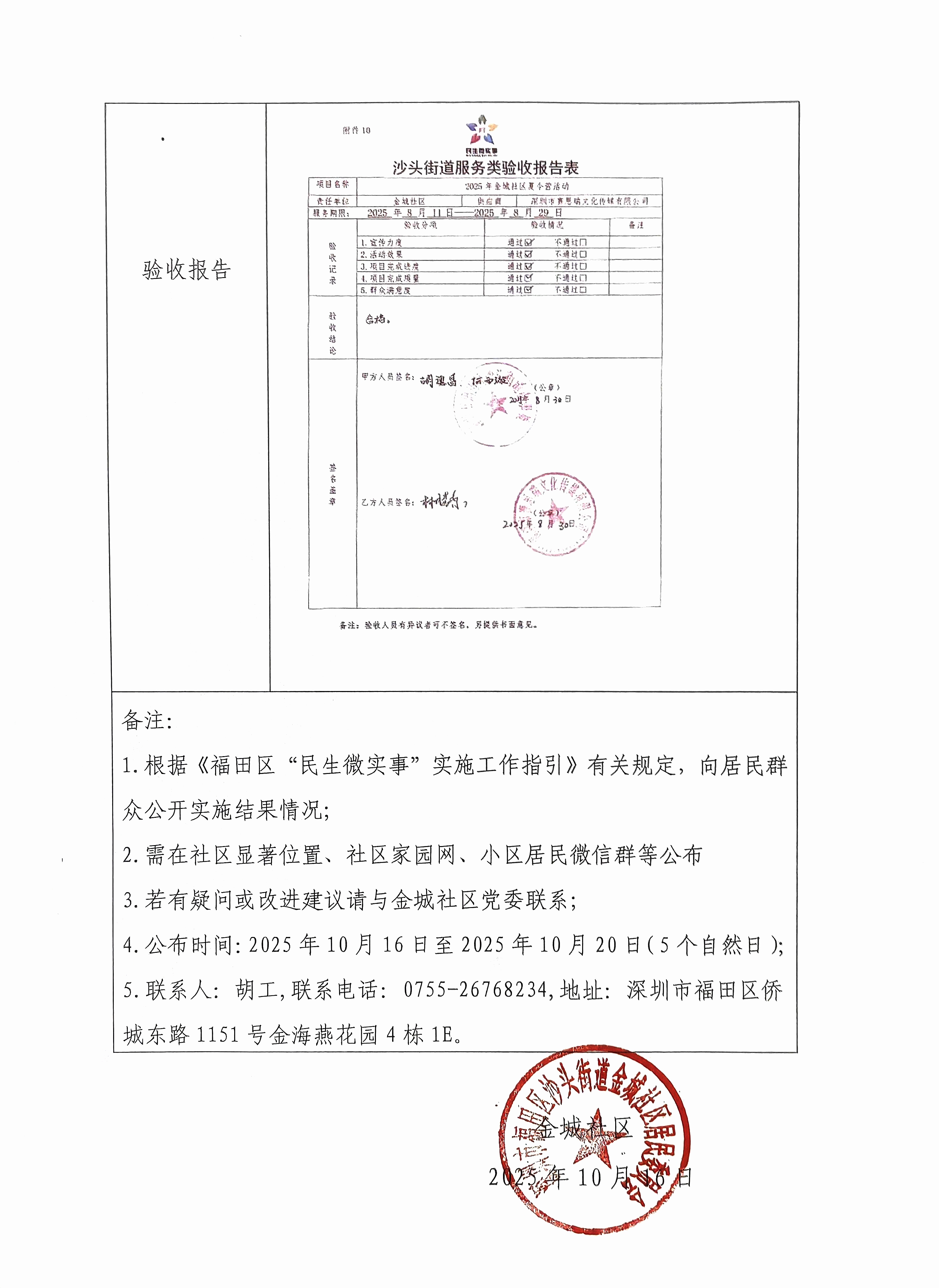 项目公示|福田区沙头街道金城社区2025年金城社区夏令营活动“民生微实事”项目实施结果公开及验收报告公示