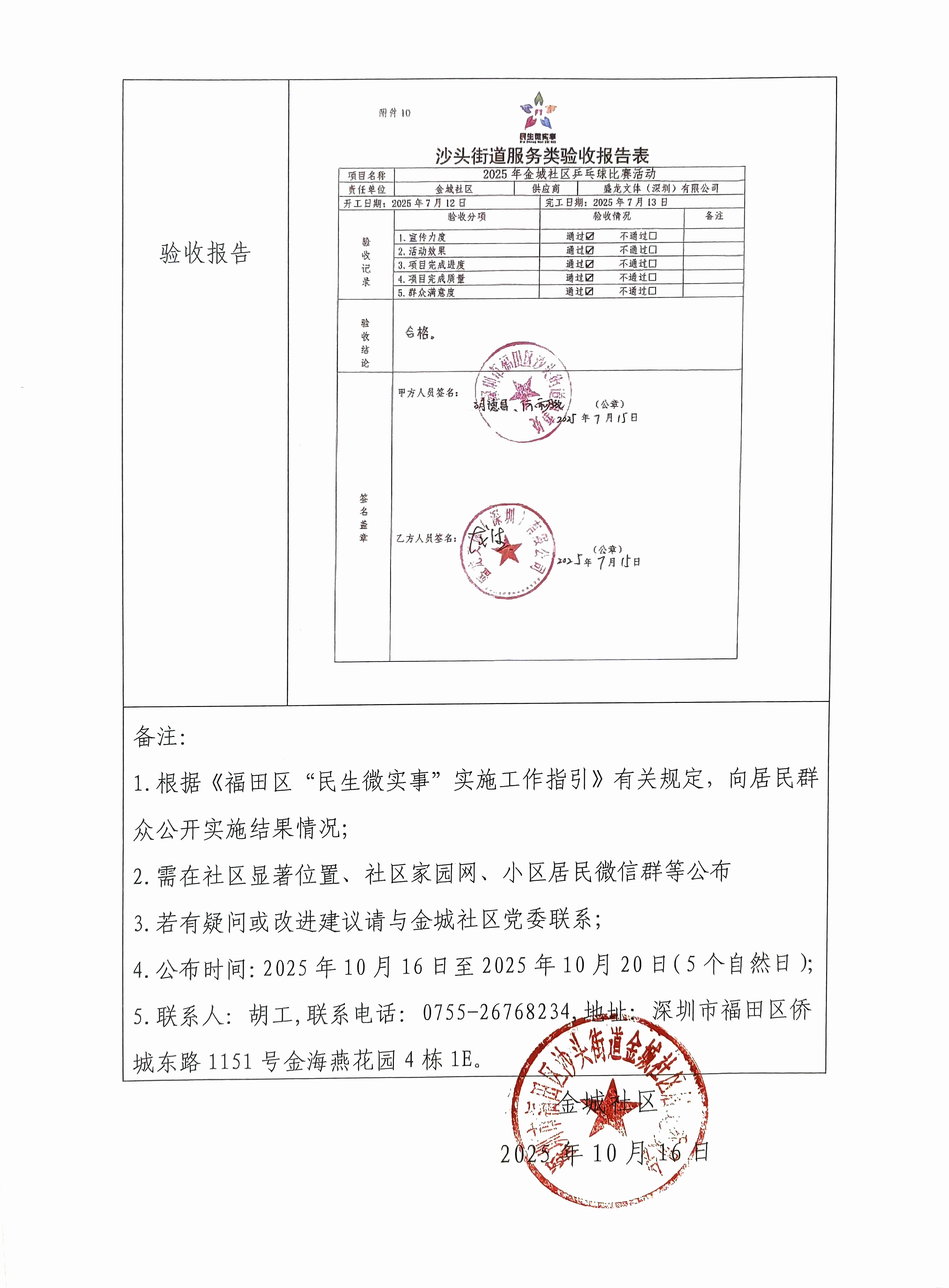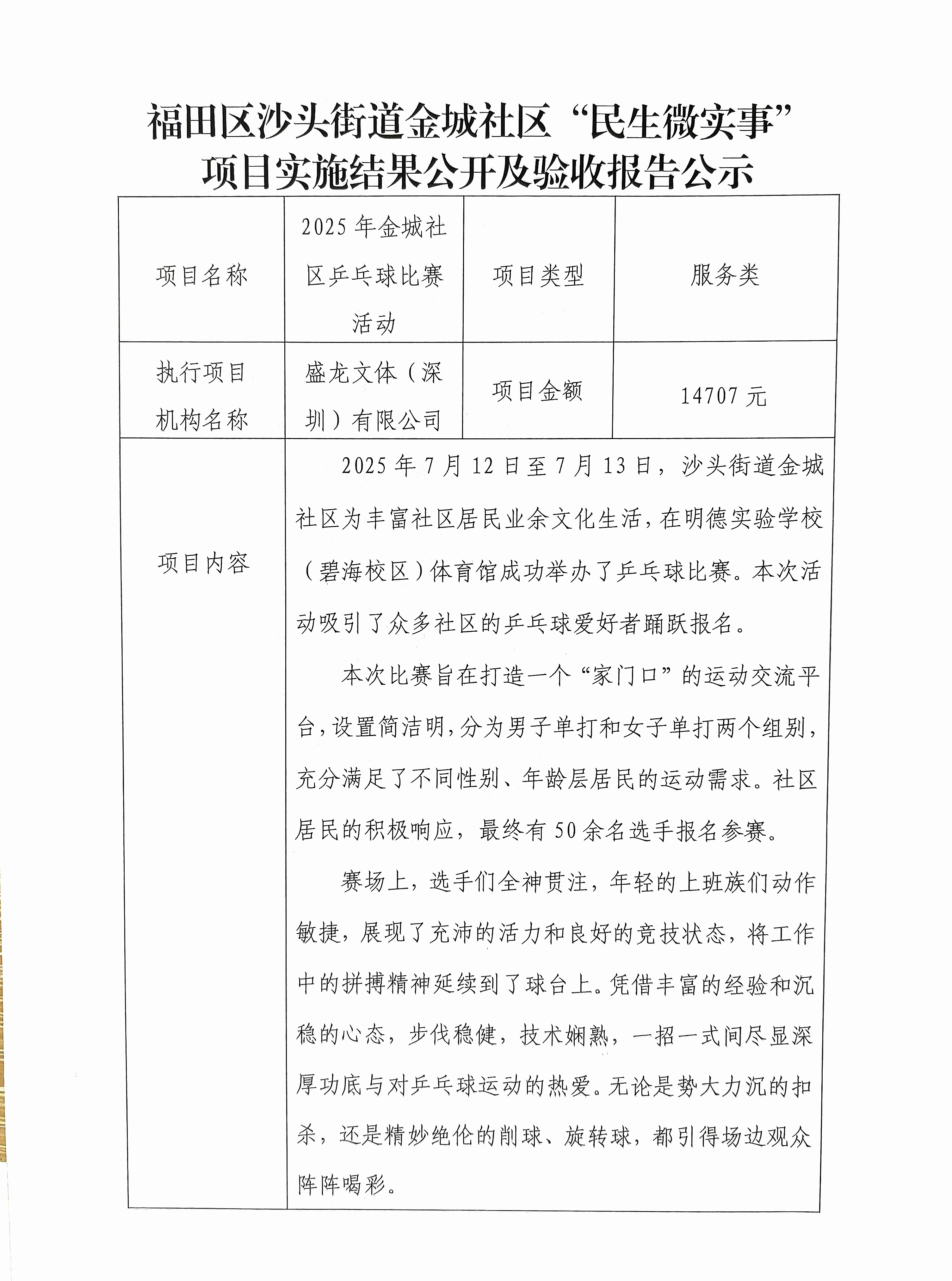 项目公示|福田区沙头街道金城社区2025年金城社区乒乓球比赛活动“民生微实事”项目实施结果公开及验收报告公示
