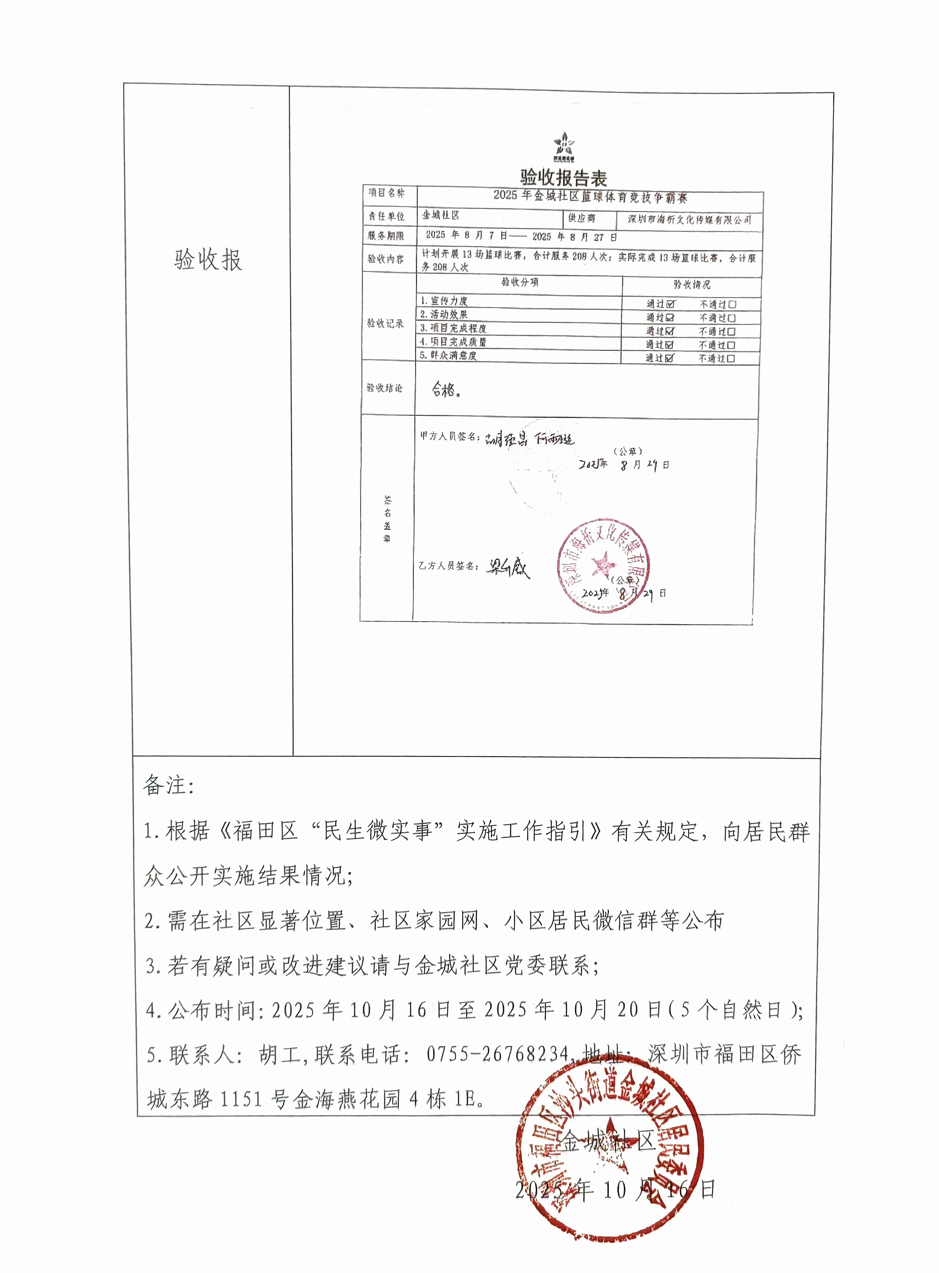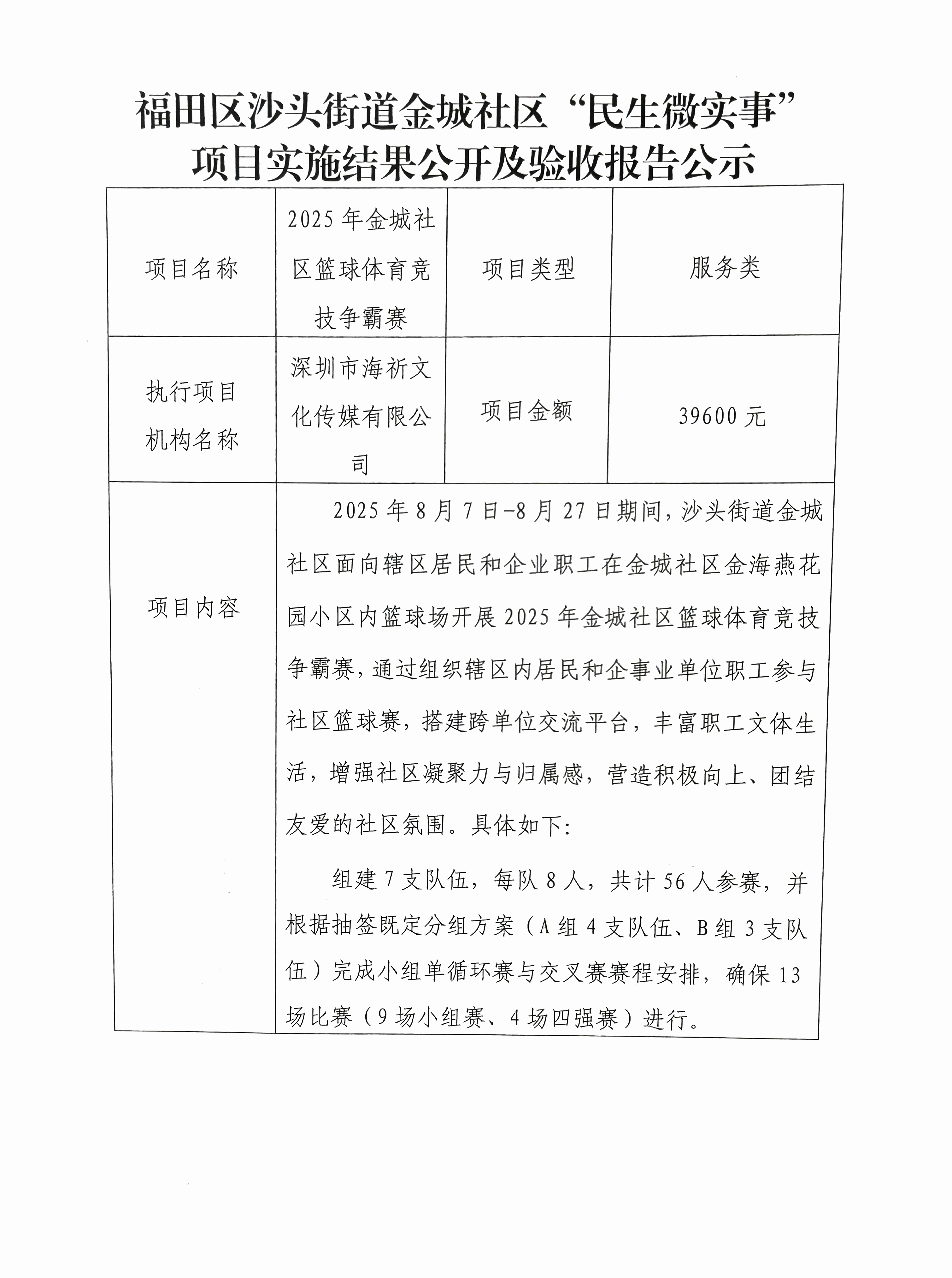 项目公示|福田区沙头街道金城社区2025年金城社区篮球体育竞技争霸赛“民生微实事”项目实施结果公开及验收报告公示