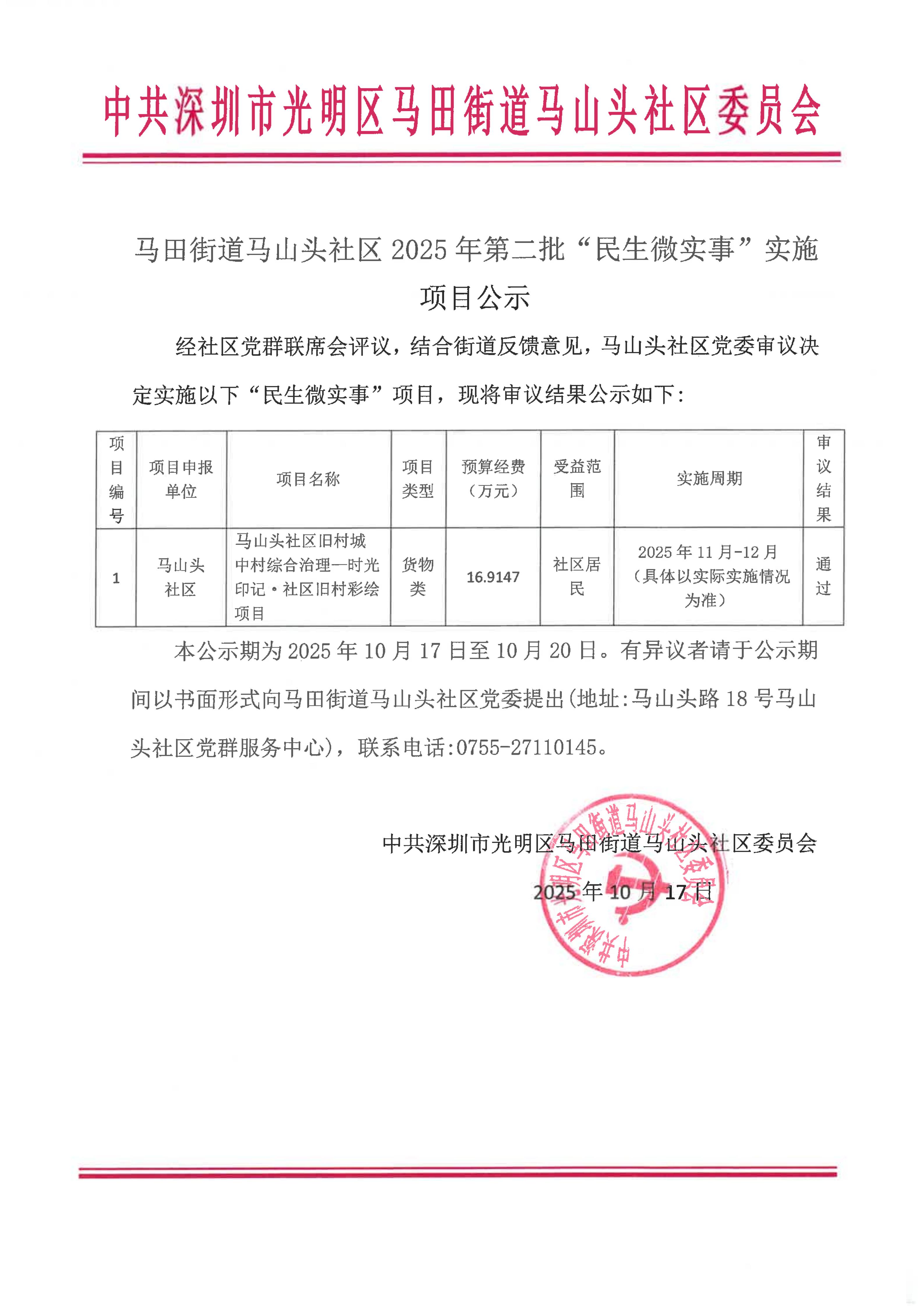 项目公示|光明区马田街道马山头社区2025年第二批“民生微实事”实施项目公示
