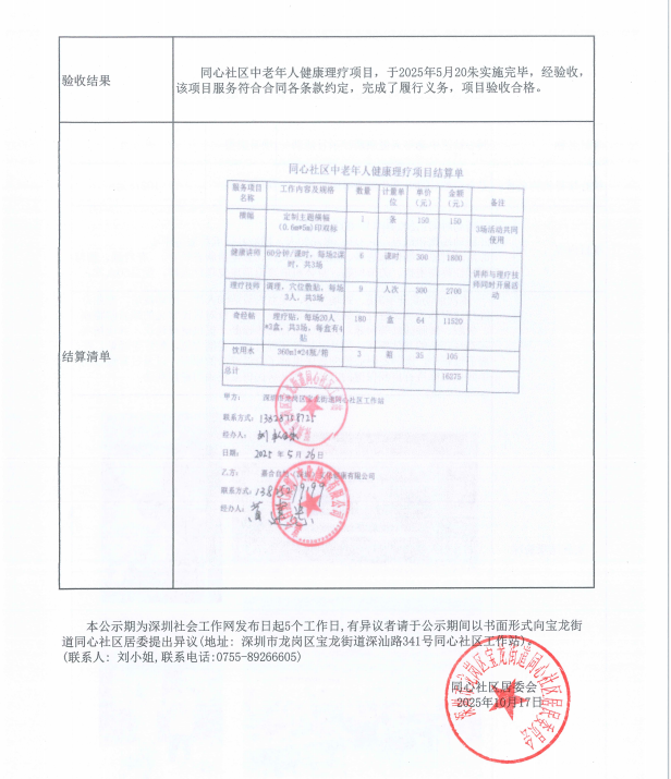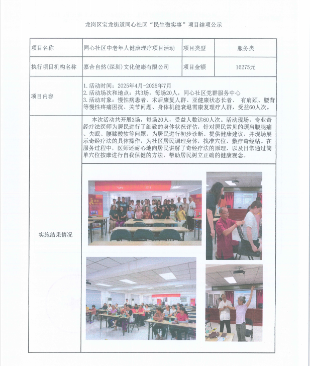 项目公示|龙岗区宝龙街道同心社区2025年中老年人健康理疗项目活动“民生微实事”项目结项公示