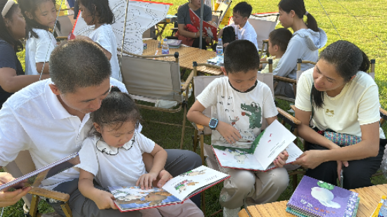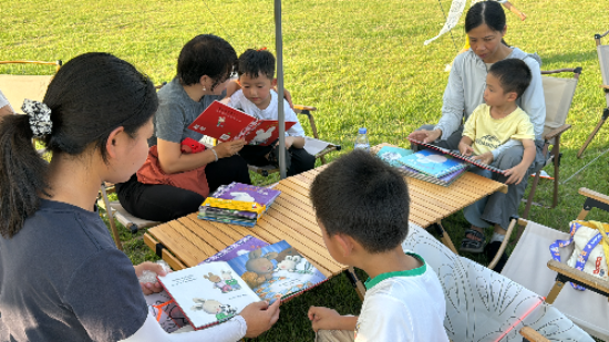 活动现场选址在社区环境优美的足球场草坪上,特别邀请高级绘本老师到现场带领亲子共读。 老师以提问互动的方式开启绘本阅读,用生动的语气模仿角色对话,不时邀请孩子们互动。家长们也放下手机,和孩子并肩而坐,跟着老师的节奏轻声朗读,草坪上不时响起阵阵笑声与掌声。