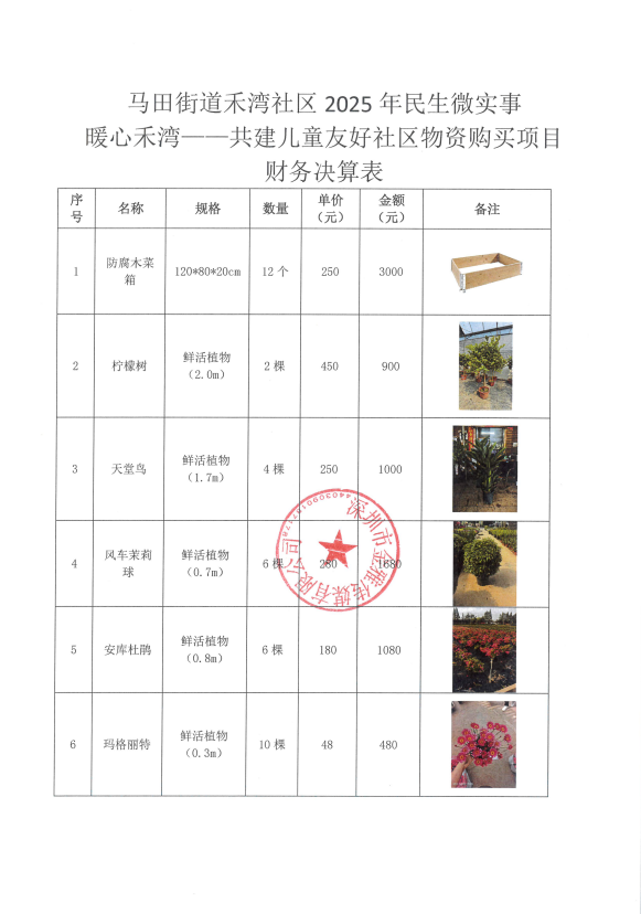 项目公示|光明区马田街道禾湾社区2025年民生微实事暖心禾湾——共建儿童友好社区物资购买项目财务决算表