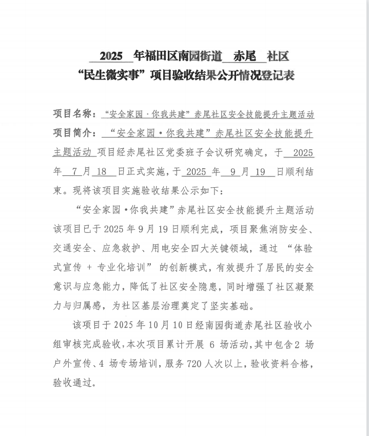 项目公示|福田区南园街道赤尾社区“安全家园·你我共建”赤尾社区安全技能提升主题活动“民生微实事”项目验收结果公开情况公示