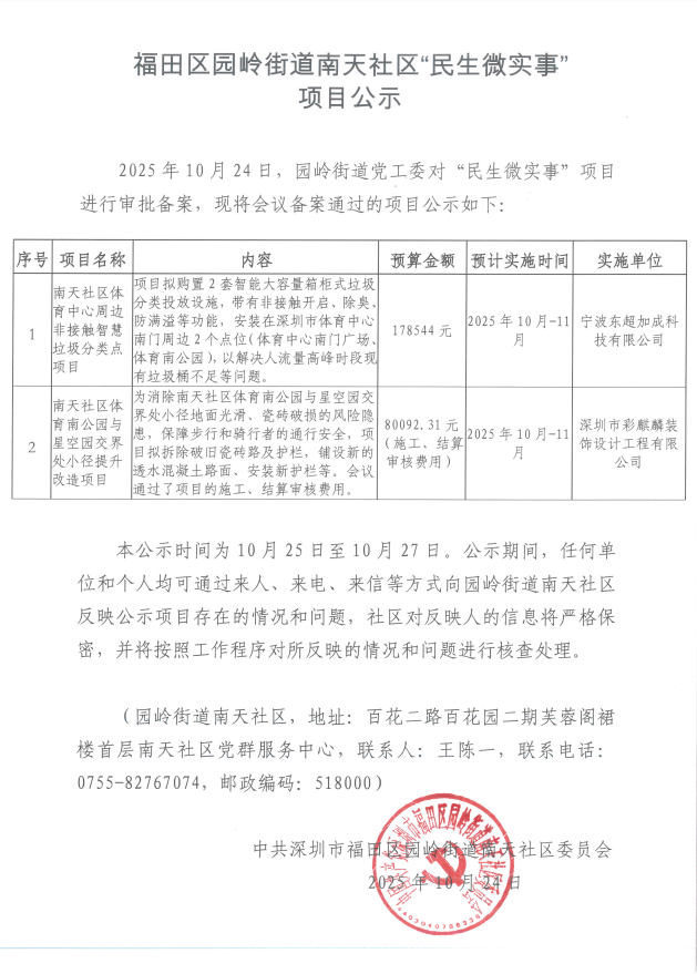 项目公示|福田区园岭街道南天社区“民生微实事”项目公示