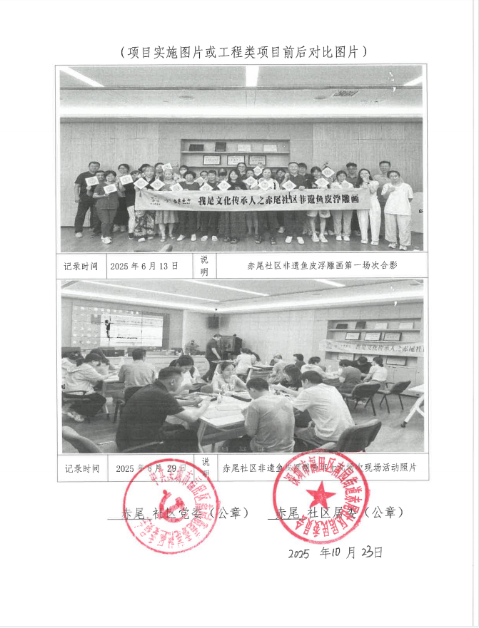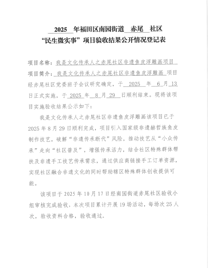 项目公示|福田区南园街道赤尾社区我是文化传承人之赤尾社区非遗鱼皮浮雕画项目“民生微实事”项目验收结果公开情况公示