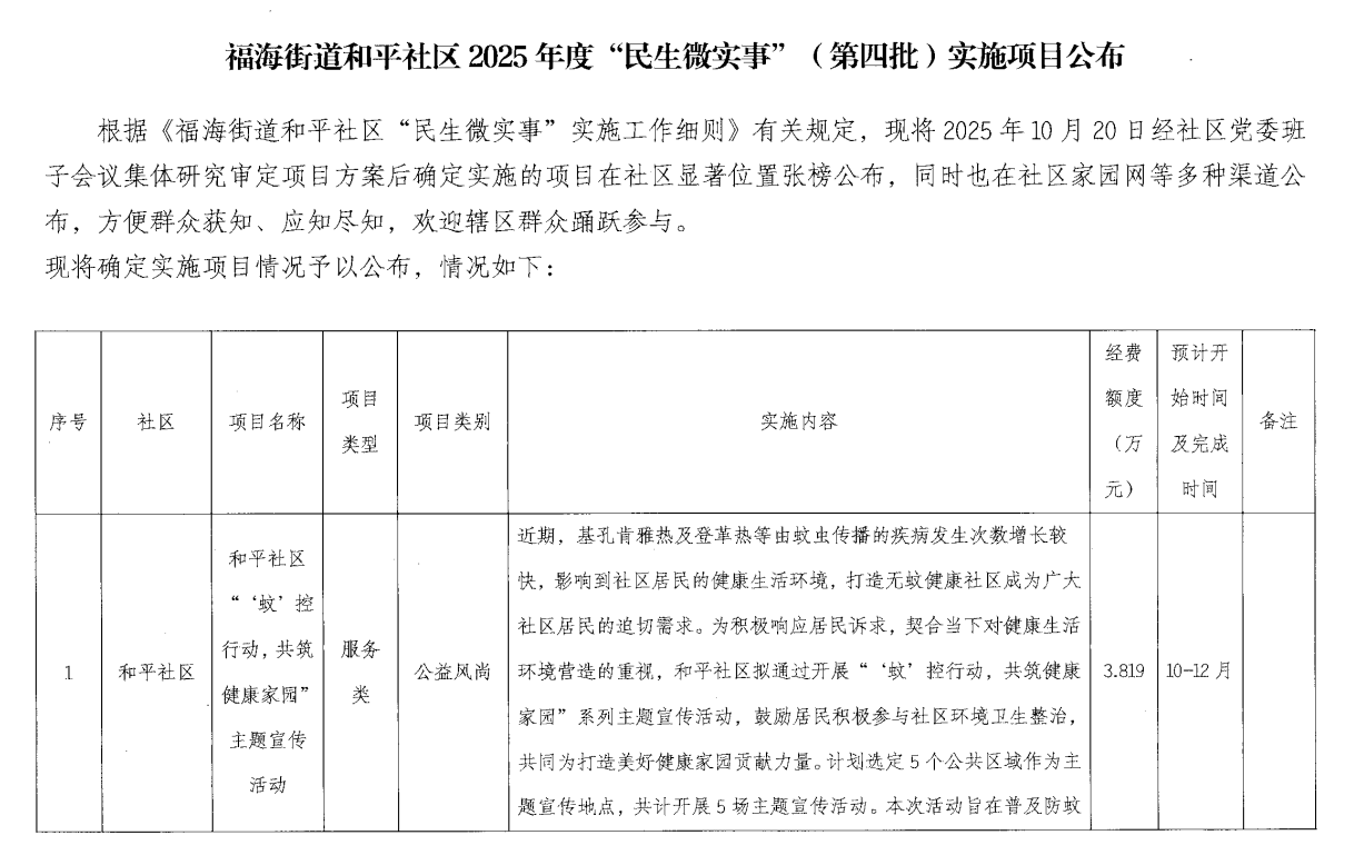 项目公示|宝安区福海街道和平社区2025年度“民生微实事”(第四批)实施项目公示