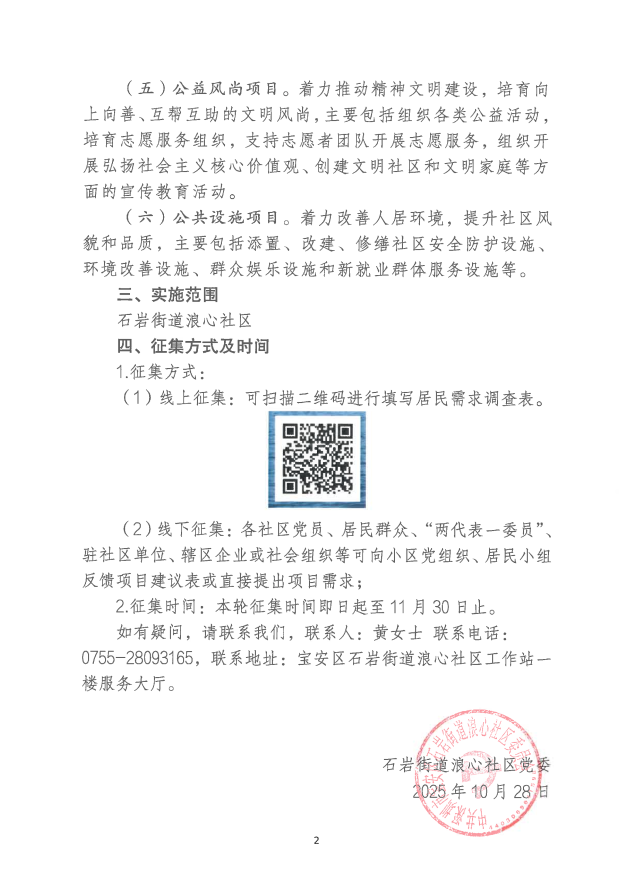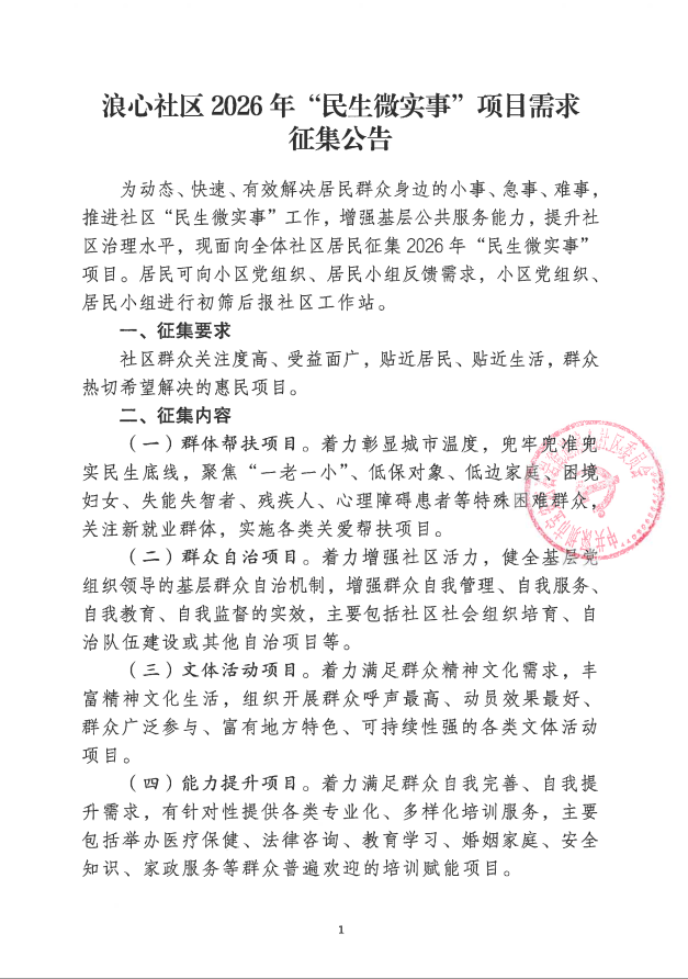 项目公示|宝安区石岩街道浪心社区2026年“民生微实事”项目需求征集公告