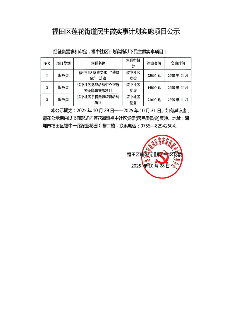 项目公示|福田区莲花街道福中社区2025年民生微实事计划实施项目公示