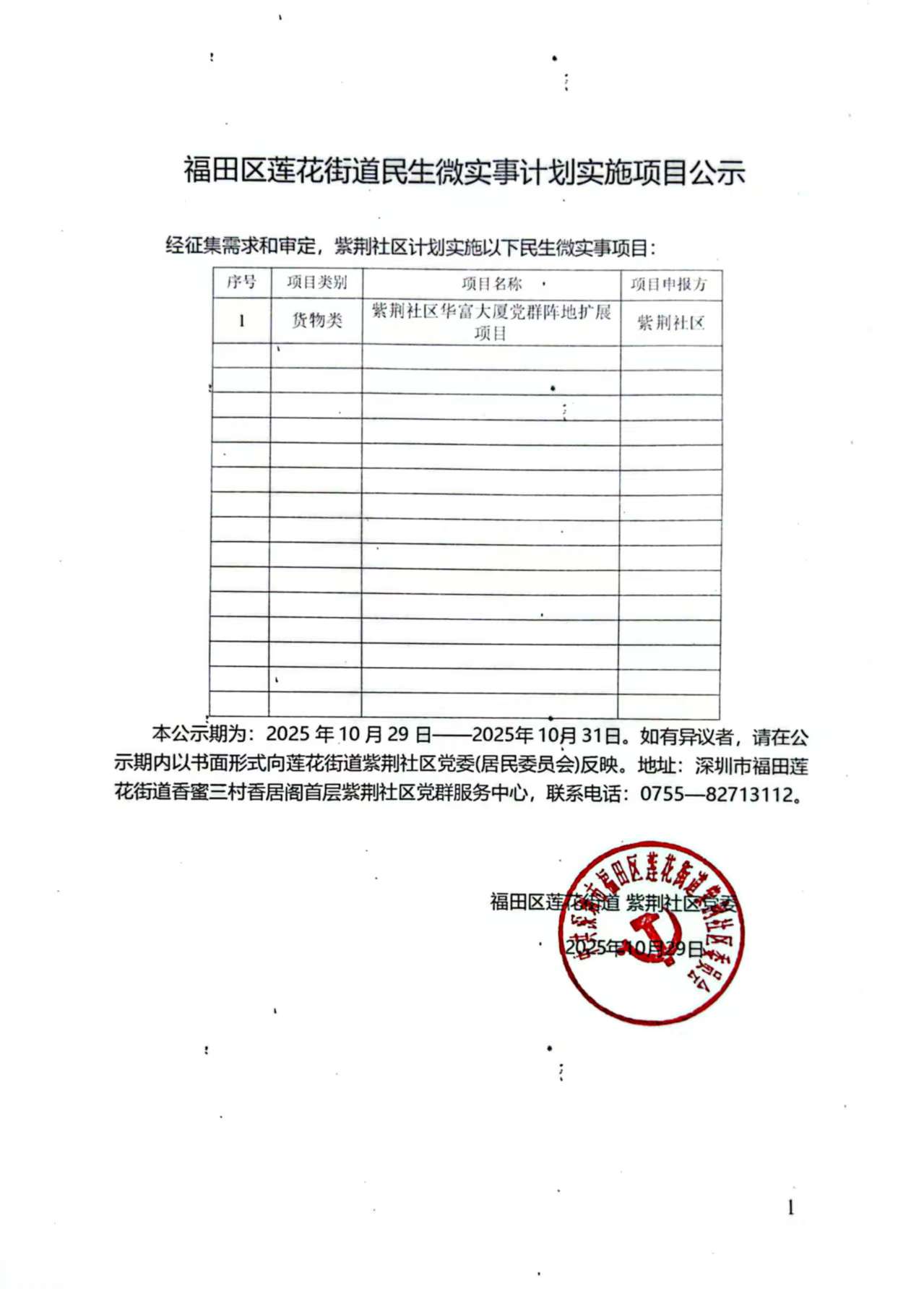 项目公示|福田区莲花街道紫荆社区华富大厦党群阵地扩展项目“民生微实事”计划实施项目公示