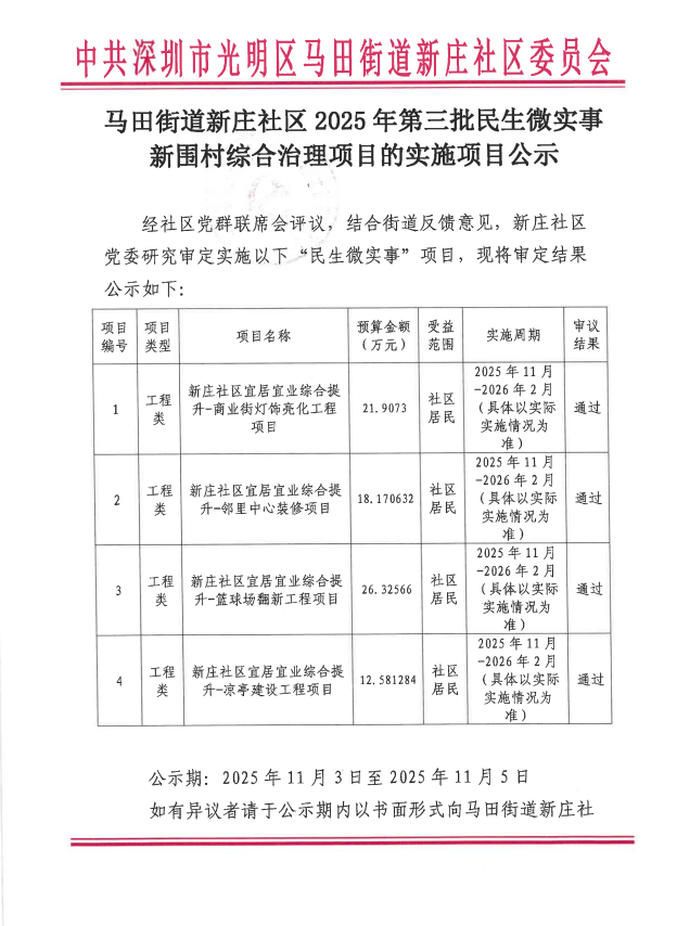 项目公示|光明区马田街道新庄社区2025年第三批民生微实事新围村综合治理项目的实施项目公示