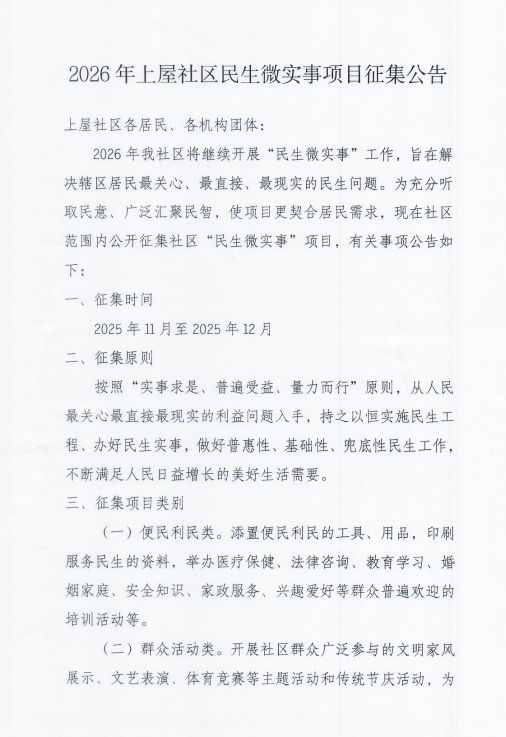 项目公示|宝安区石岩街道上屋社区2026年民生微实事项目征集公告