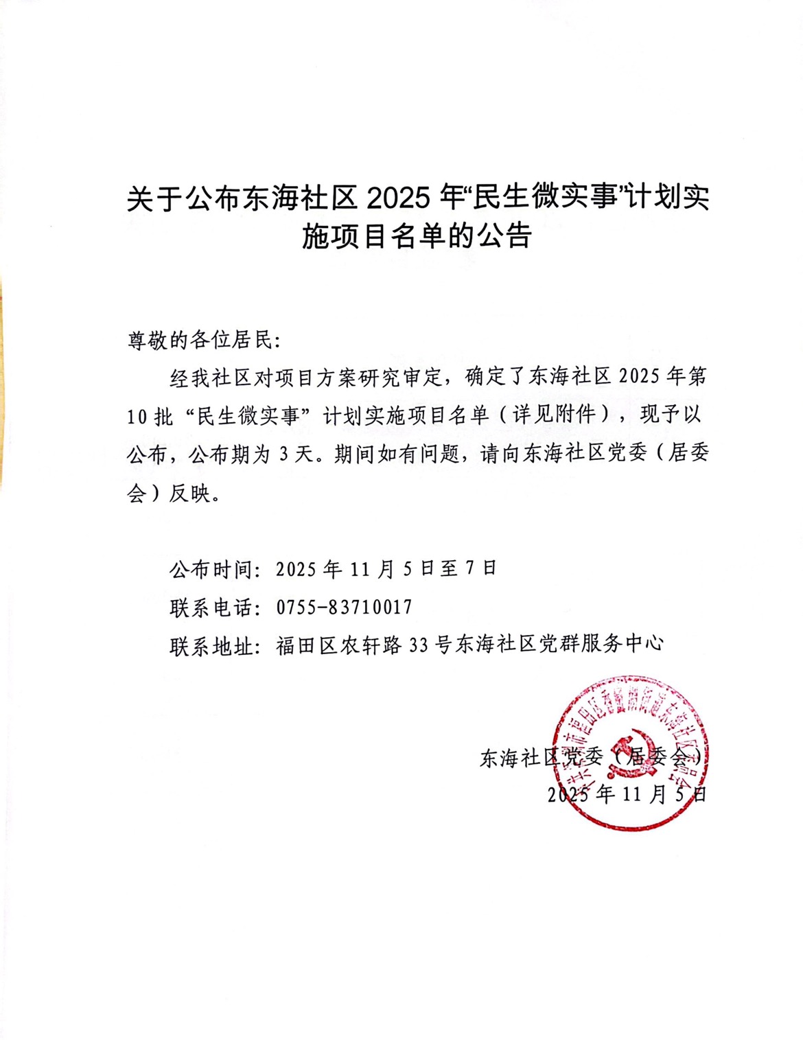 项目公示|福田区香蜜湖街道东海社区2025年第十批“民生微实事”计划实施项目名单公告