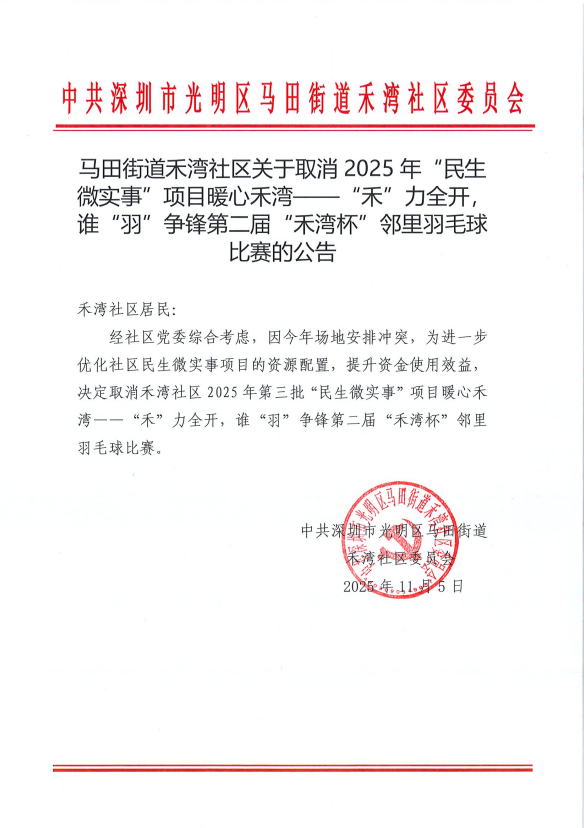 项目公示|光明区马田街道禾湾社区关于取消 2025 年“民生微实事”项目暖心禾湾——“禾”力全开,谁“羽”争锋第二届“禾湾杯”邻里羽毛球比赛的公告