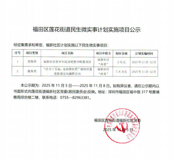 项目公示|福田区莲花街道福新社区2025年“民生微实事”项目计划实施项目公示