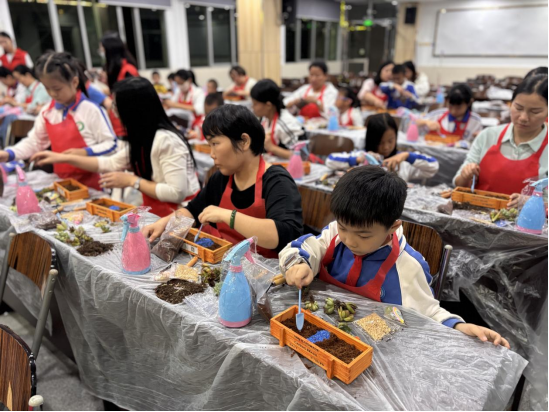 2025年10月29至30日在公明社区党群服务中心开展亲子多肉盆栽活动。活动吸引了近40组亲子家庭踊跃参与,现场气氛热烈,欢声笑语不断。活动邀了专业园艺老师向家长和孩子们介绍了多肉植物的品种、生长习性、日常养护技巧以及盆栽种植的注意事项。从如何选土、浇水到光照需求,老师讲解得细致入微,孩子们听得聚精会神,家长们也纷纷拿起手机记录下关键知识点。