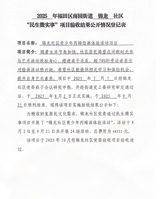 项目公示|福田区南园街道锦龙社区青少年丙烯绘画体验活动项目“民生微实事”项目验收结果公开情况公示