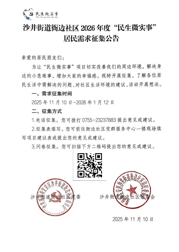 项目公示|宝安区沙井街道衙边社区2026年度“民生微实事”居民需求征集公告