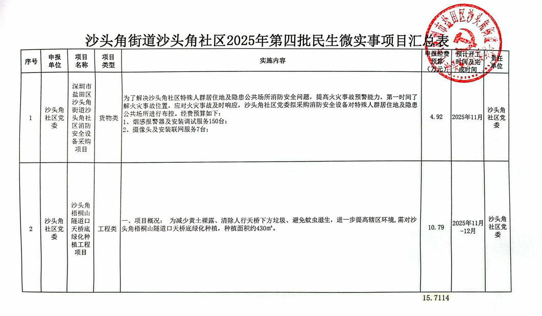 为了落实市委市政府关于“民生微实事”的工作要求,提升辖区居民生活质量,沙头角社区党委结合社区实际及居民需求,推选出2025年第四批“民生微实事”项目,现就项目情况进行公示。如有问题及建议,请于3个工作日内向社区反馈。