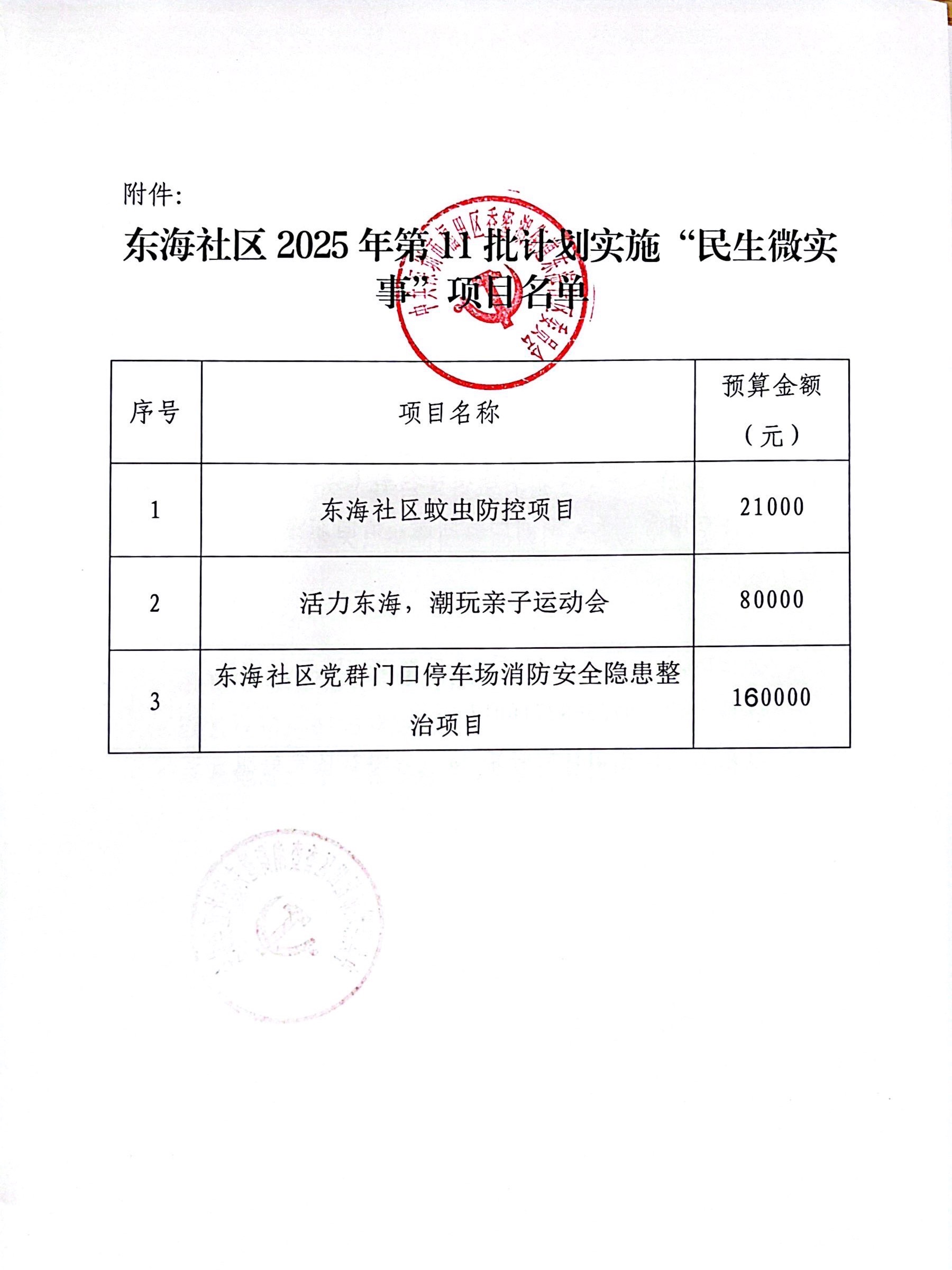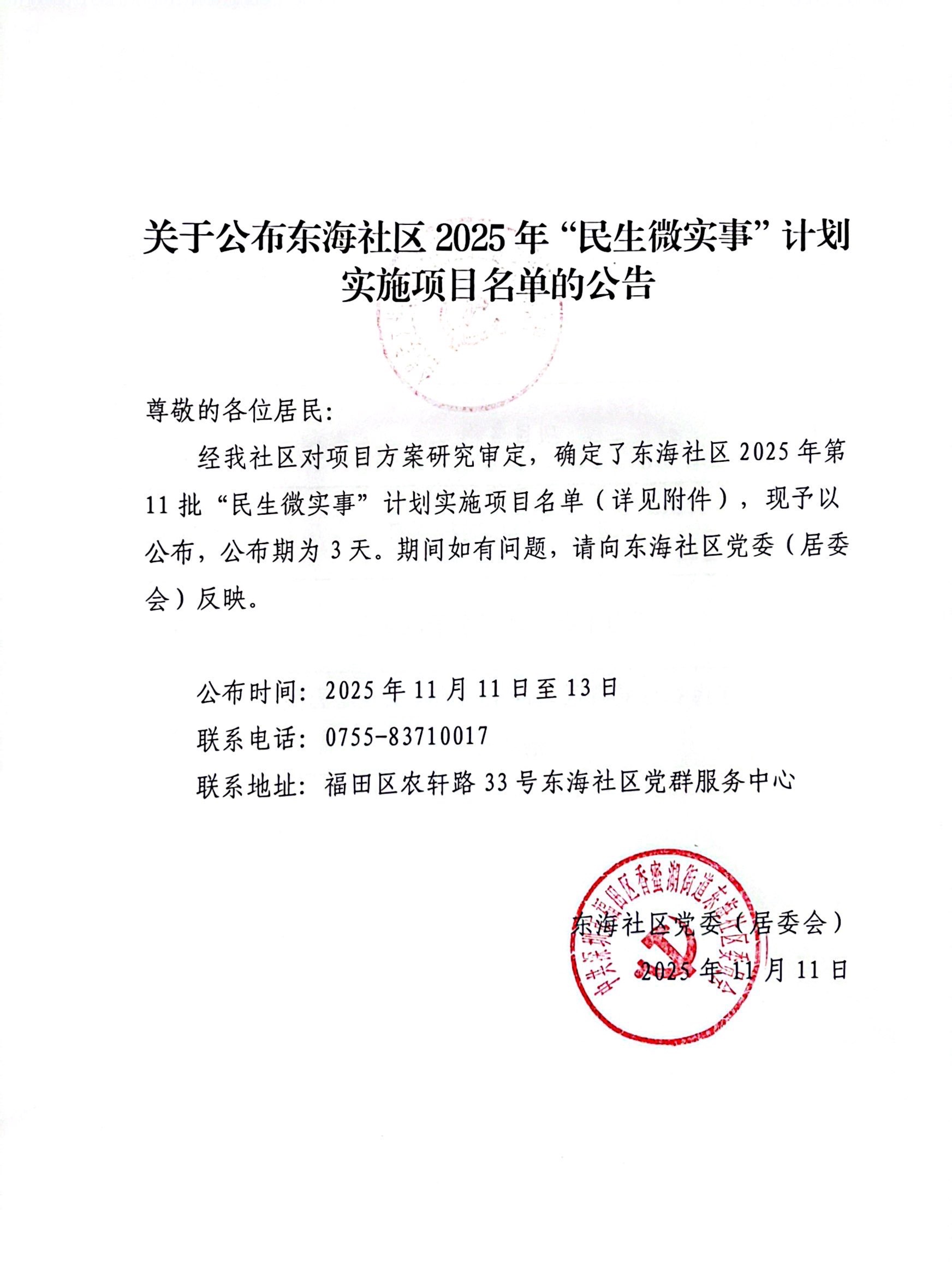 项目公示|福田区香蜜湖街道东海社区2025年第十一批“民生微实事”计划实施项目名单公告