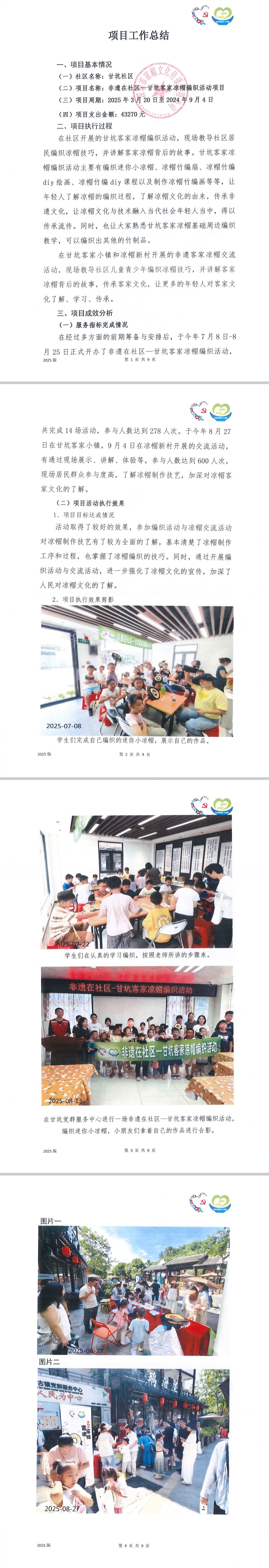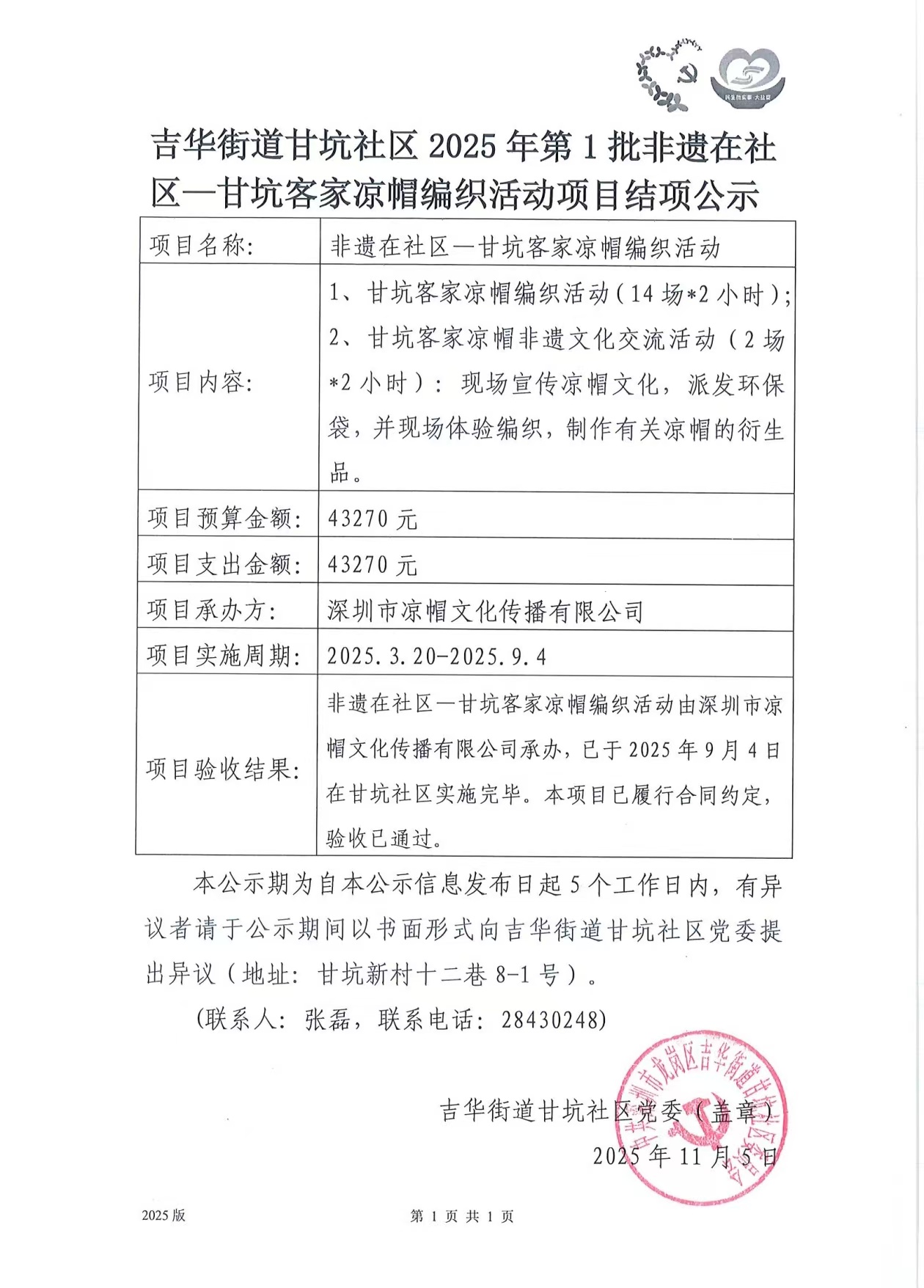 项目公示|龙岗区吉华街道甘坑社区2025年第1批非遗在社区—甘坑客家凉帽编织活动“民生微实事”项目结项公示