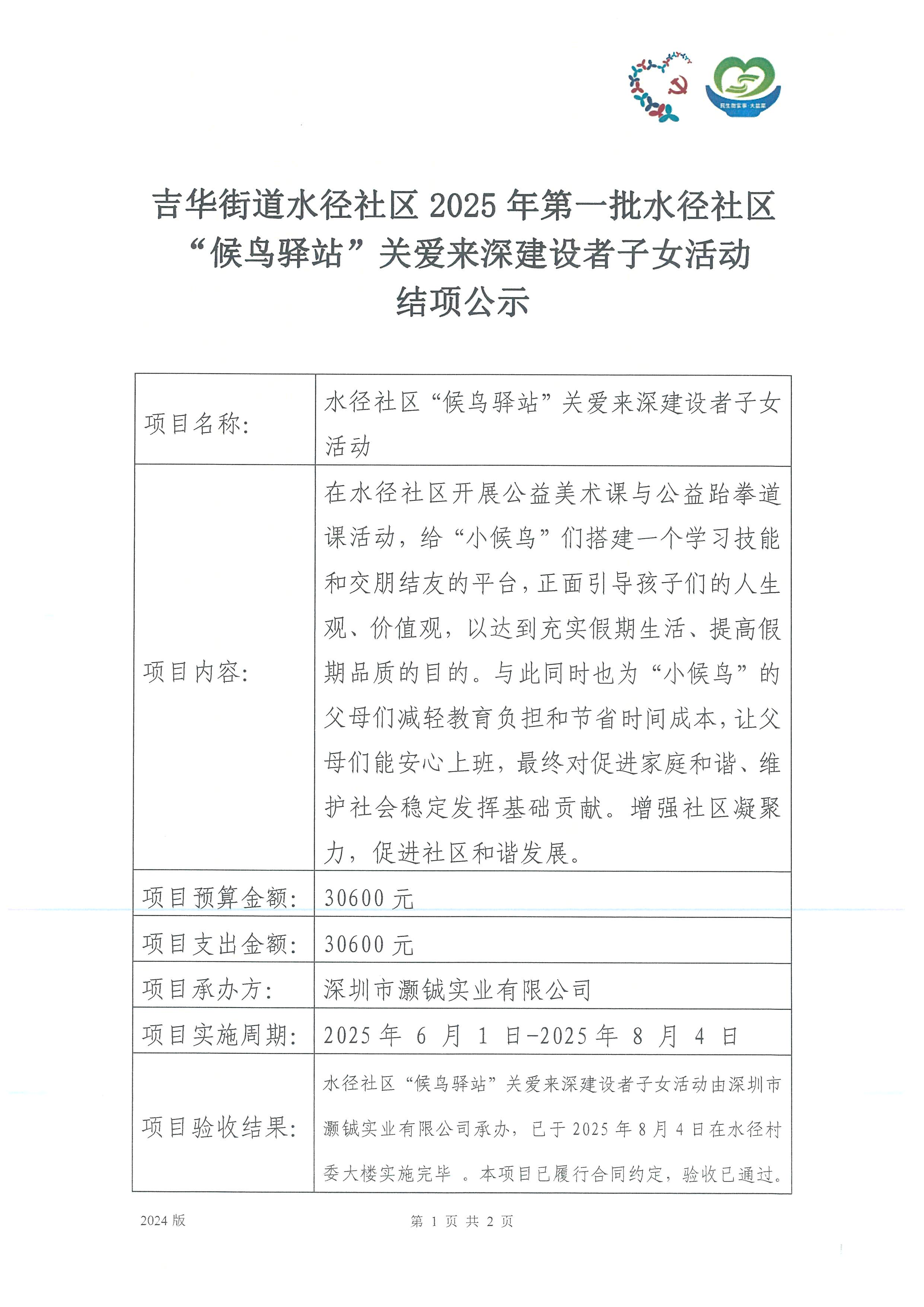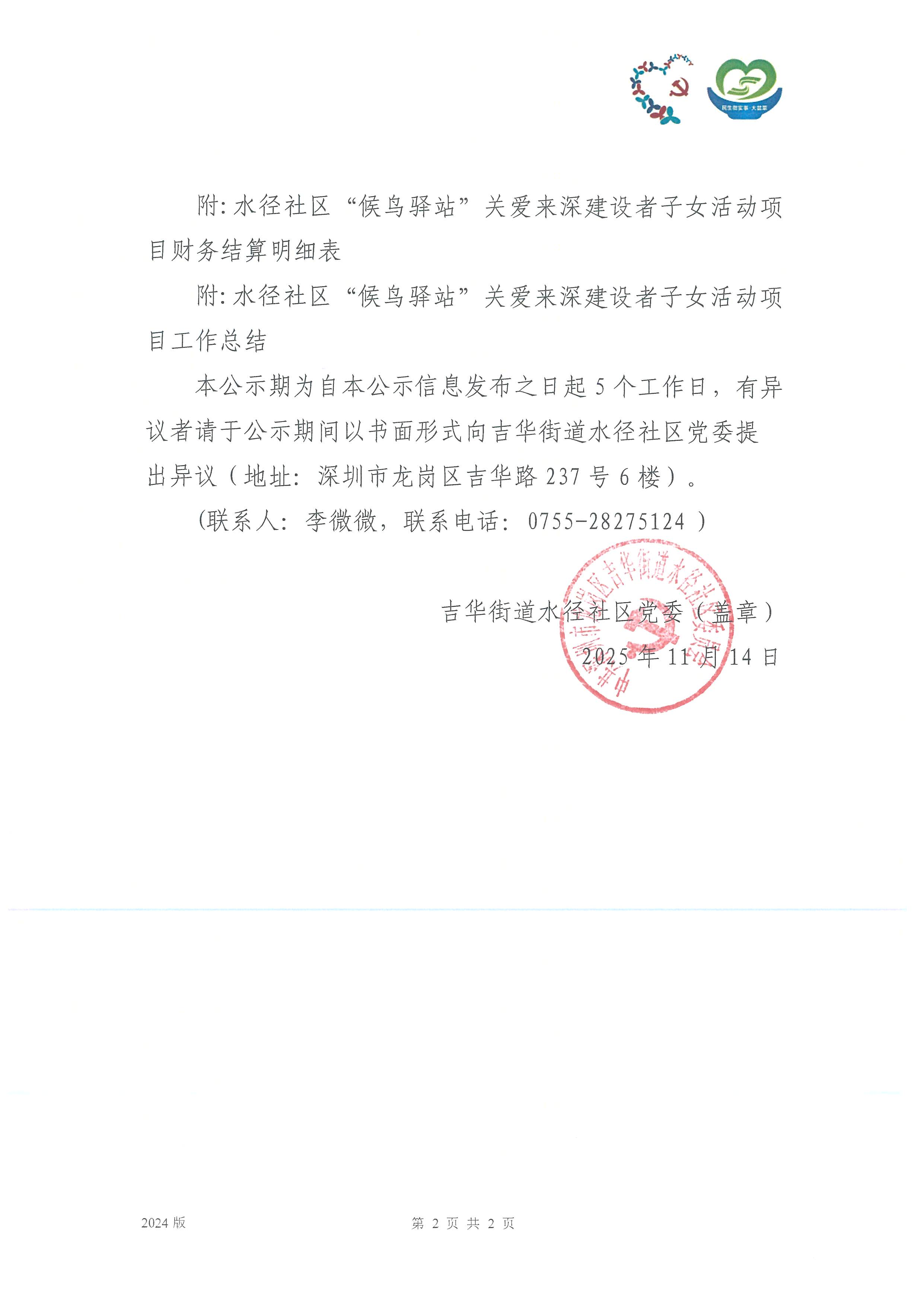项目公示|龙岗区吉华街道水径社区2025年“候鸟驿站”关爱来深建设者子女活动项目“民生微实事·大盆菜”项目结项公示
