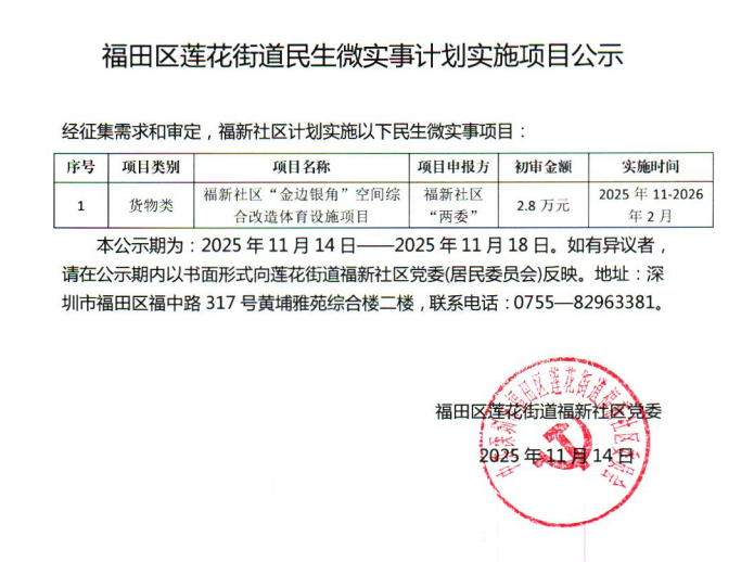 项目公示|福田区莲花街道福新社区2025年“民生微实事”项目计划实施项目公示