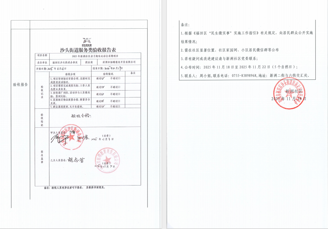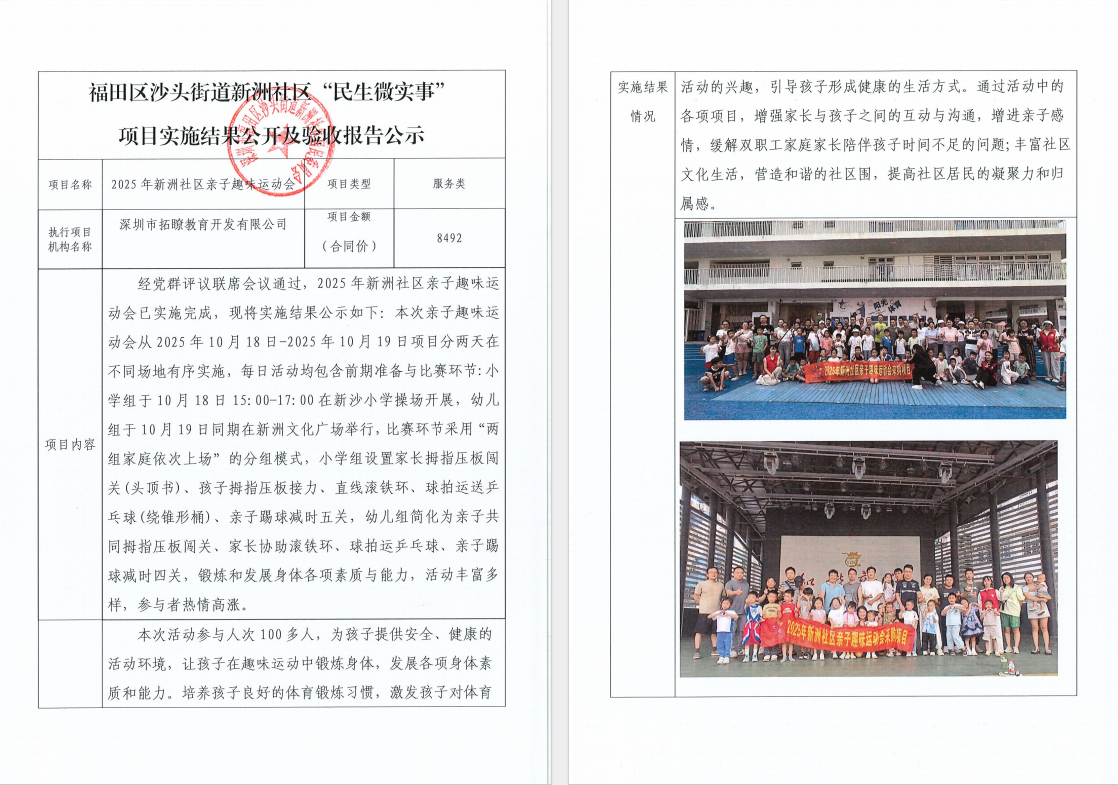 项目公示|福田区沙头街道新洲社区2025年新洲社区亲子趣味运动会“民生微实事”项目实施结果公开及验收报告公示