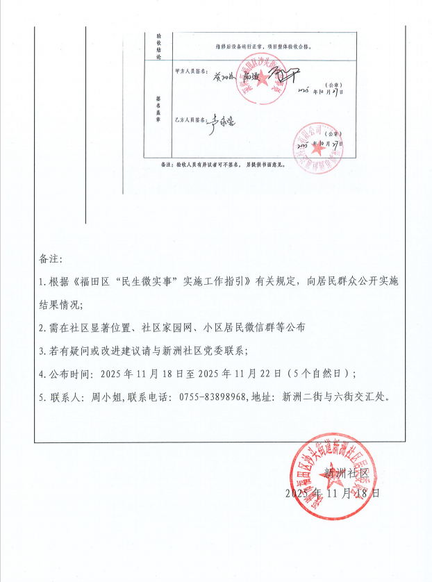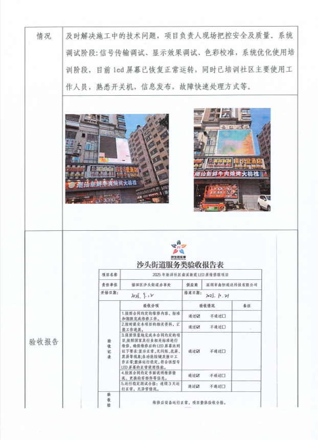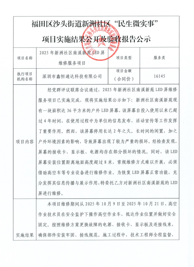 项目公示|福田区沙头街道新洲社区2025年新洲社区南溪新苑LED屏维修服务项目“民生微实事”项目实施结果公开及验收报告公示