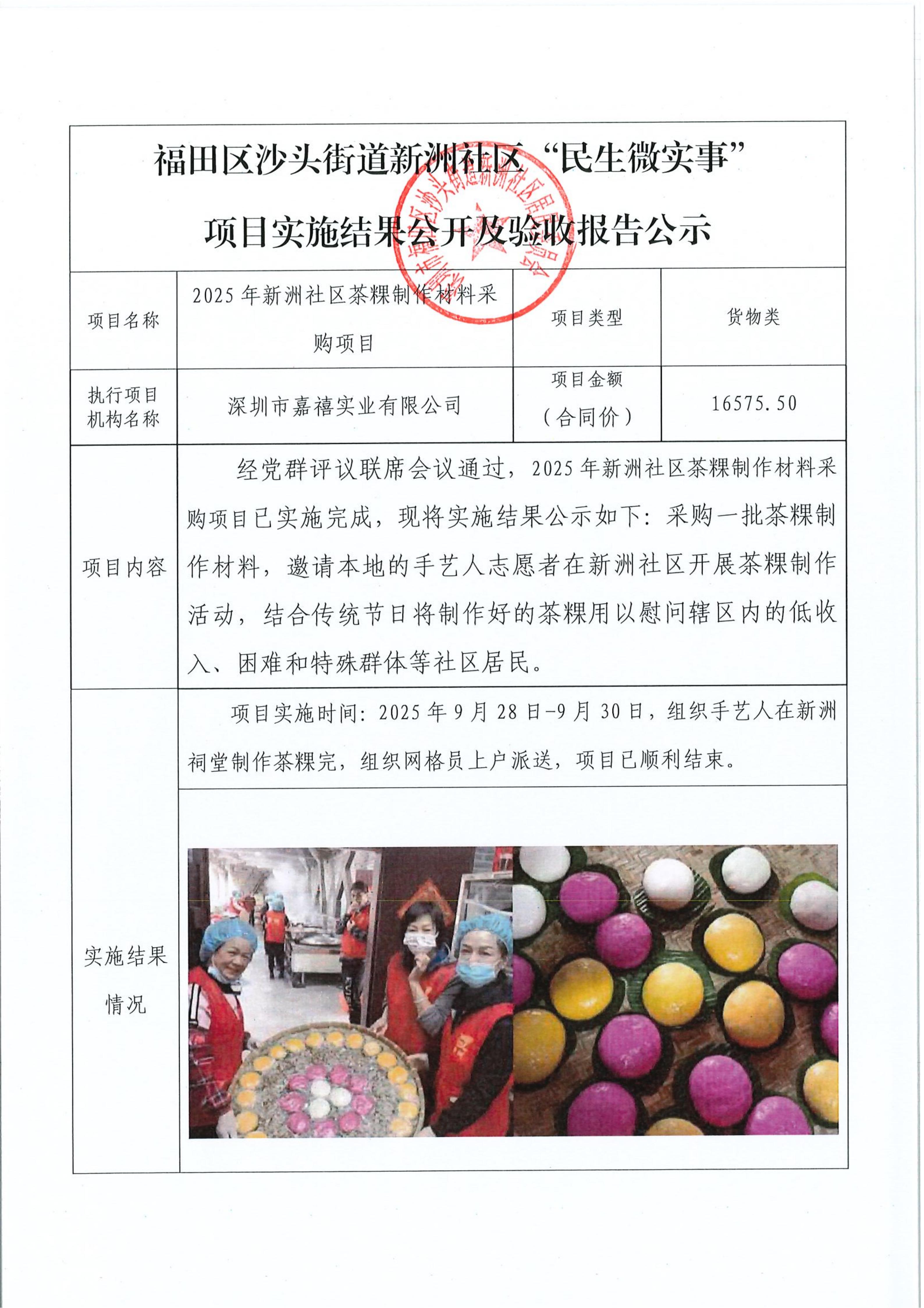 项目公示|福田区沙头街道新洲社区2025年新洲社区茶粿制作材料采购项目“民生微实事”项目实施结果公开及验收报告公示