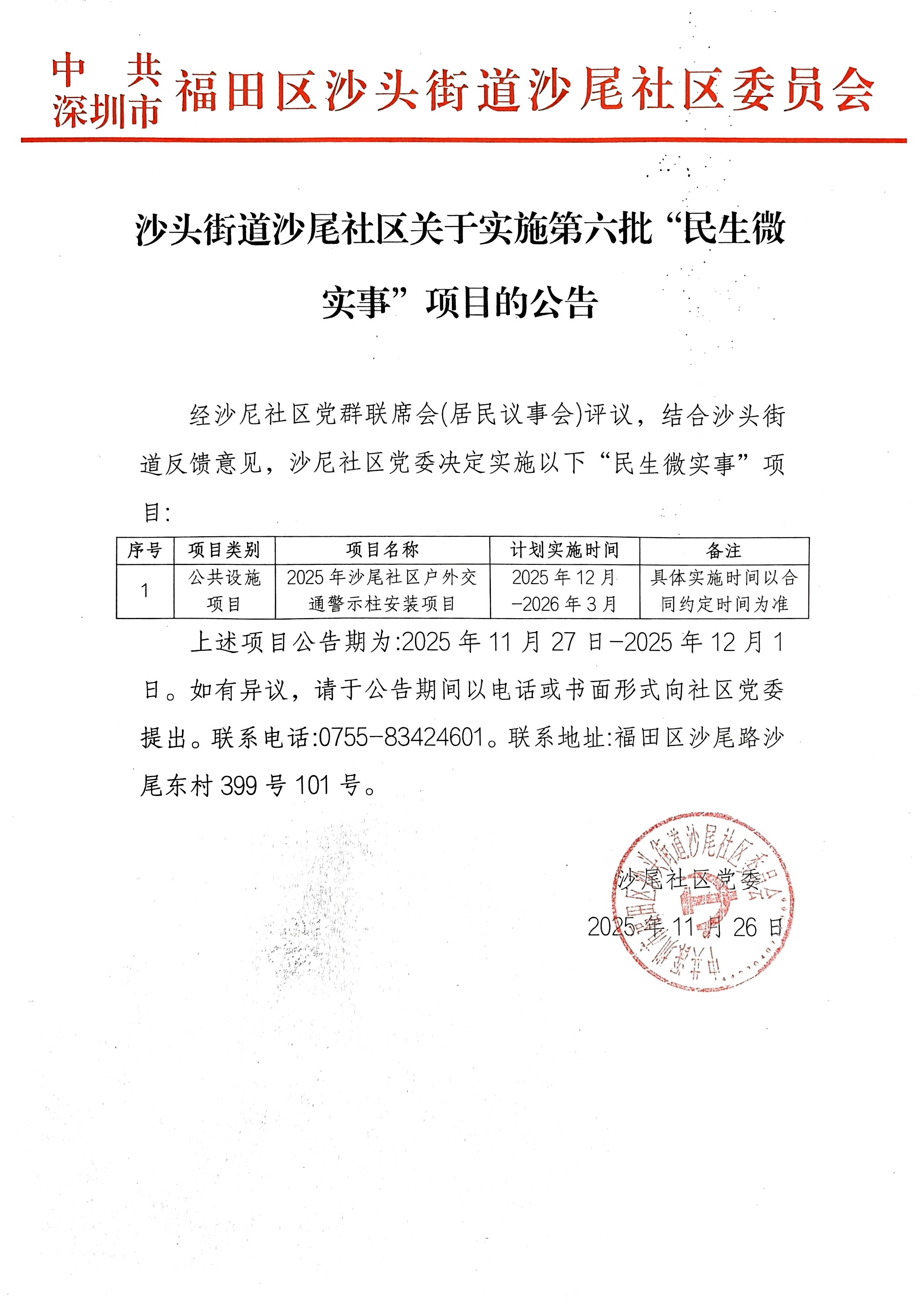 项目公示|福田区沙头街道沙尾社区2025年第六批关于实施“民生微实事”项目的公告