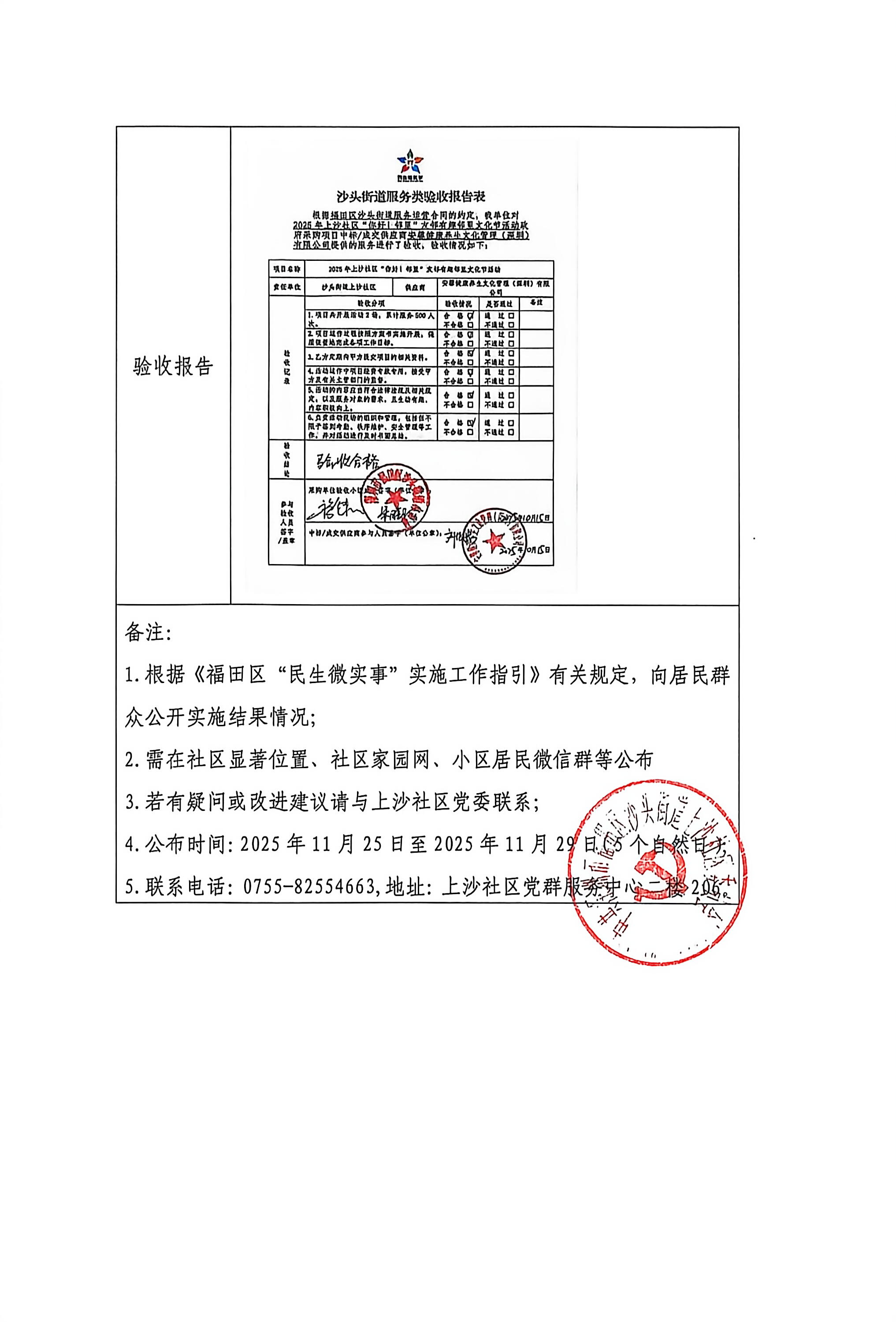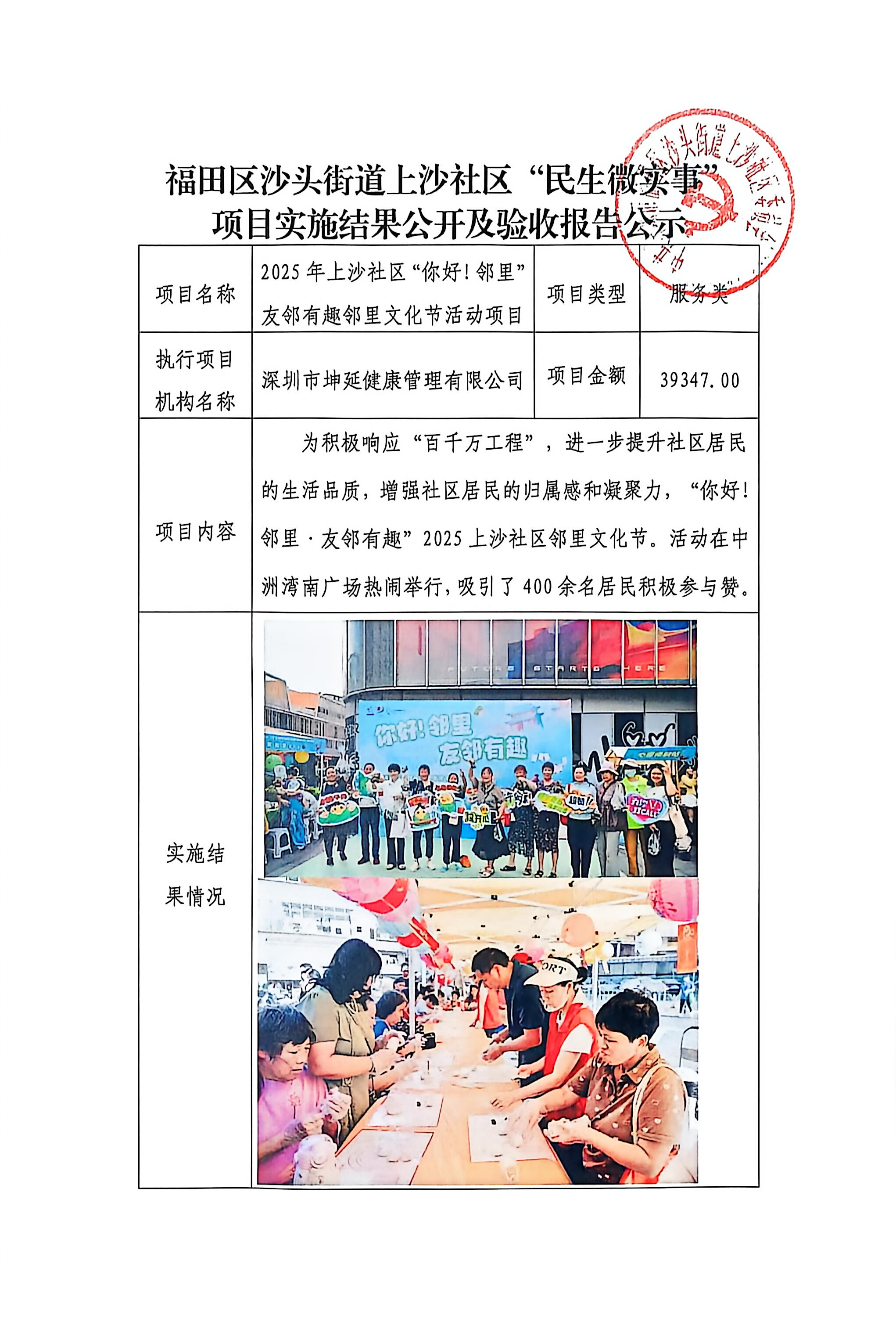 项目公示|福田区沙头街道上沙社区2025年“你好!邻里”友邻有趣邻里文化节活动“民生微实事”项目实施结果公开及验收报告公示