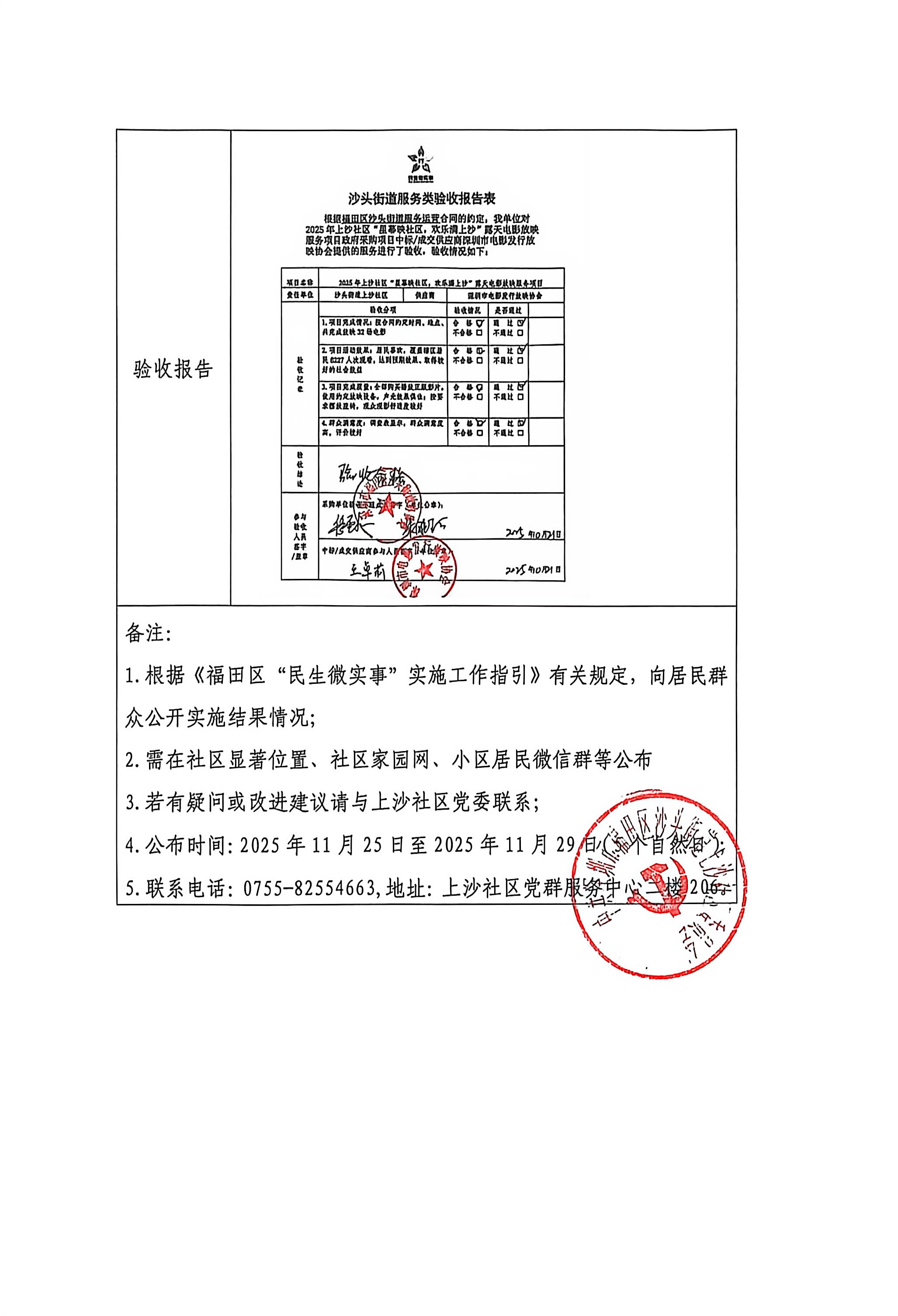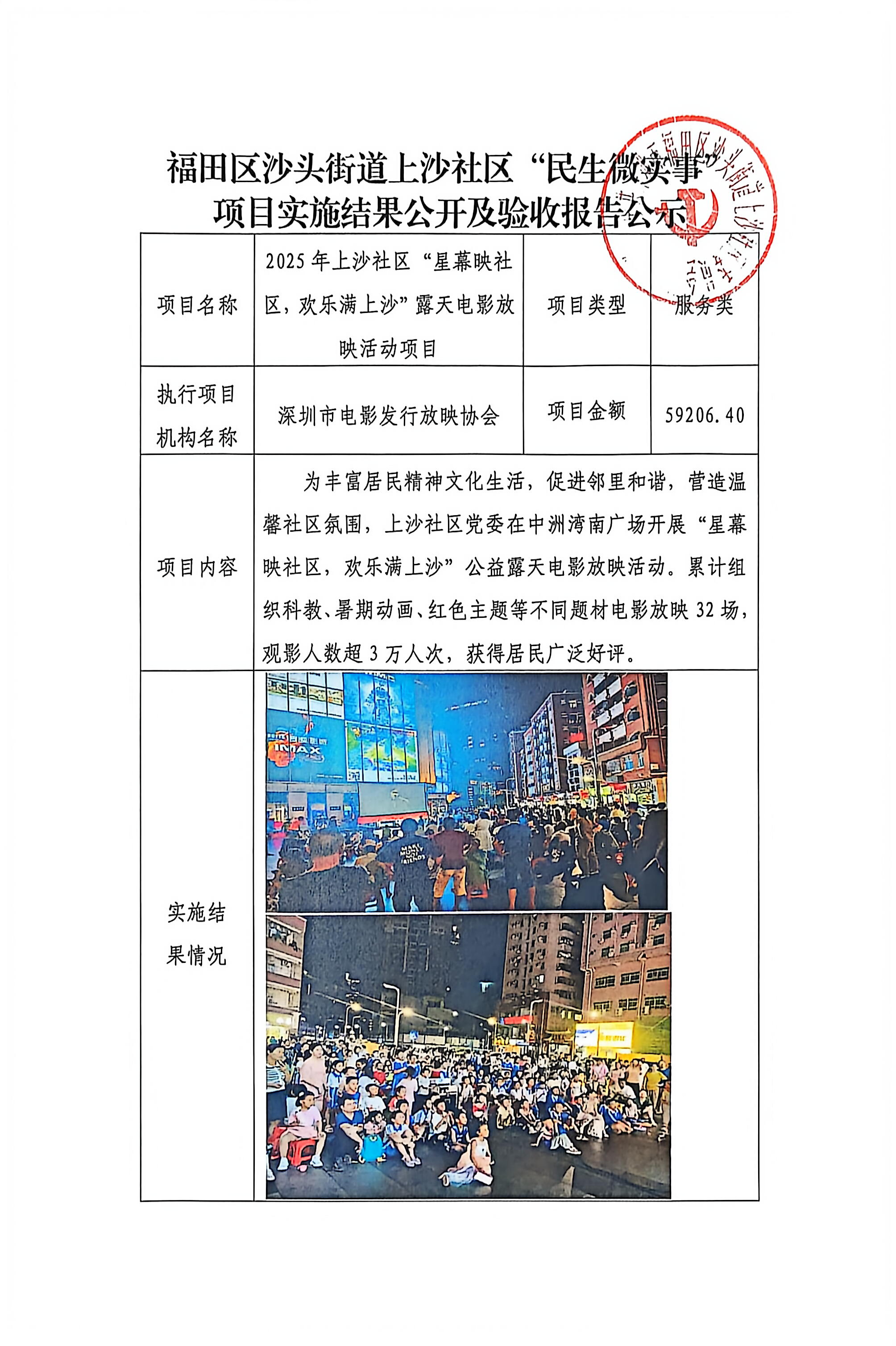 项目公示|福田区沙头街道上沙社区2025年“星幕映社区,欢乐满上沙”露天电影放映活动“民生微实事”项目实施结果公开及验收报告公示