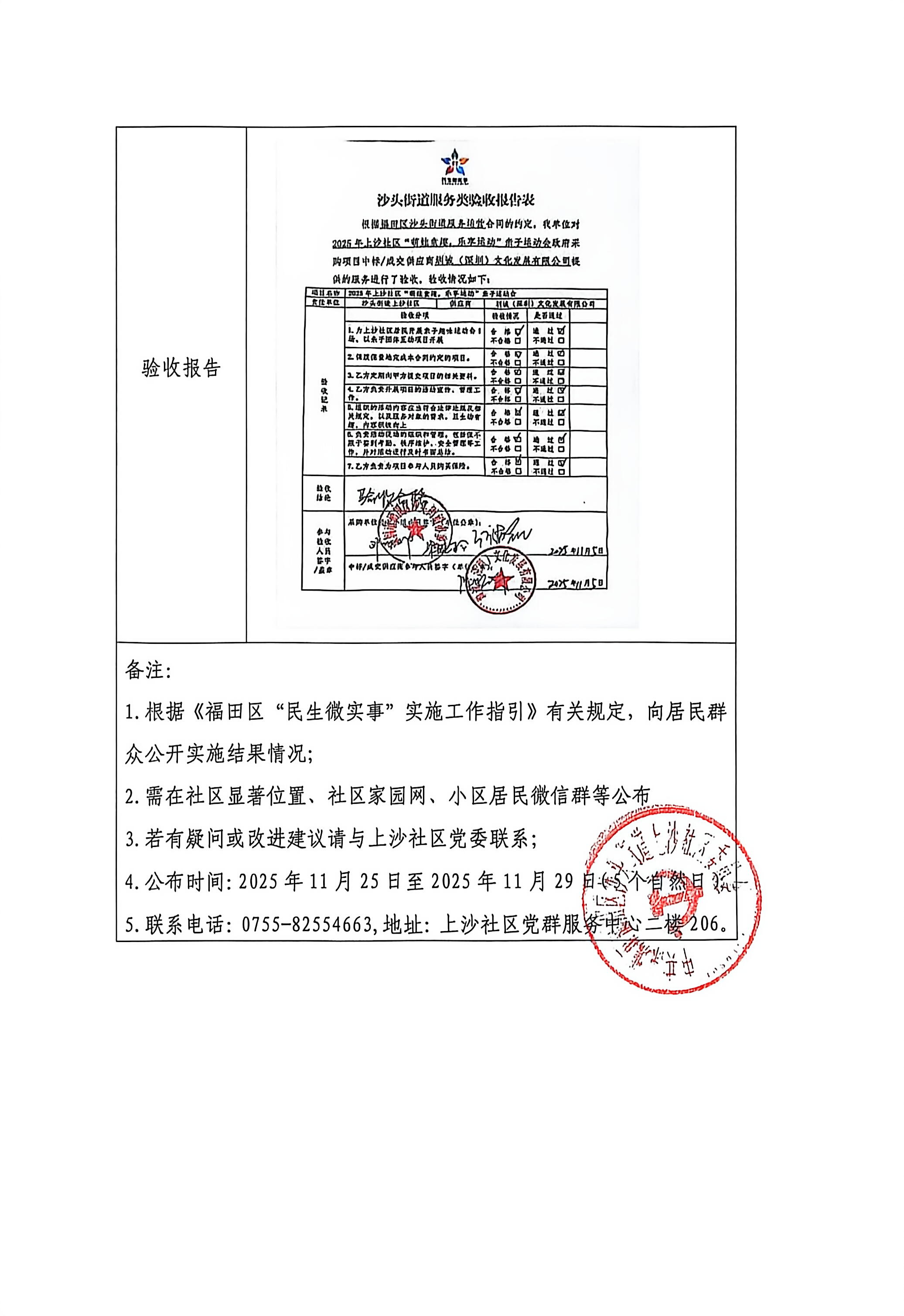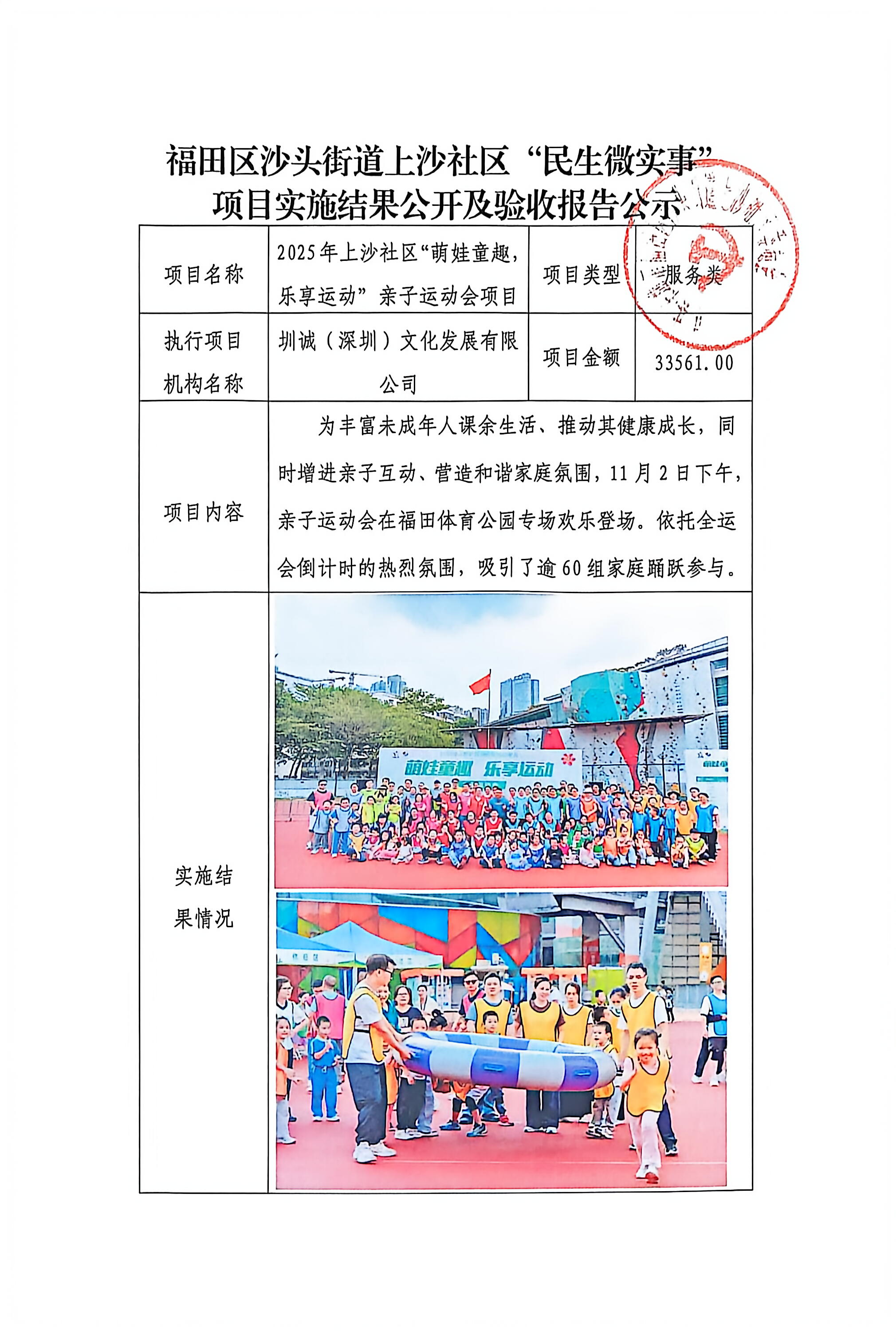 项目公示|福田区沙头街道上沙社区2025年上沙社区“萌娃童趣,乐享运动”亲子运动会项目“民生微实事”项目实施结果公开及验收报告公示