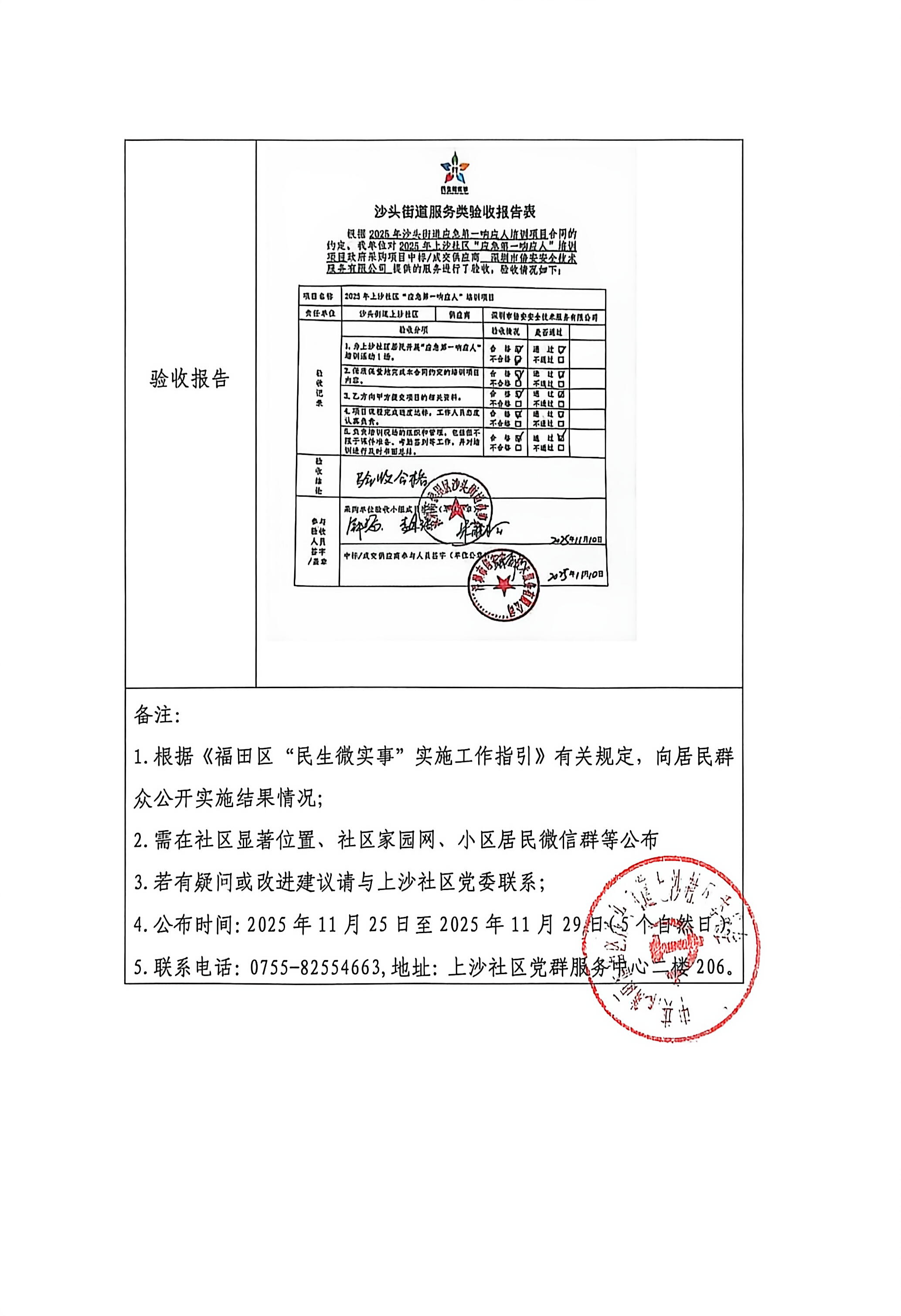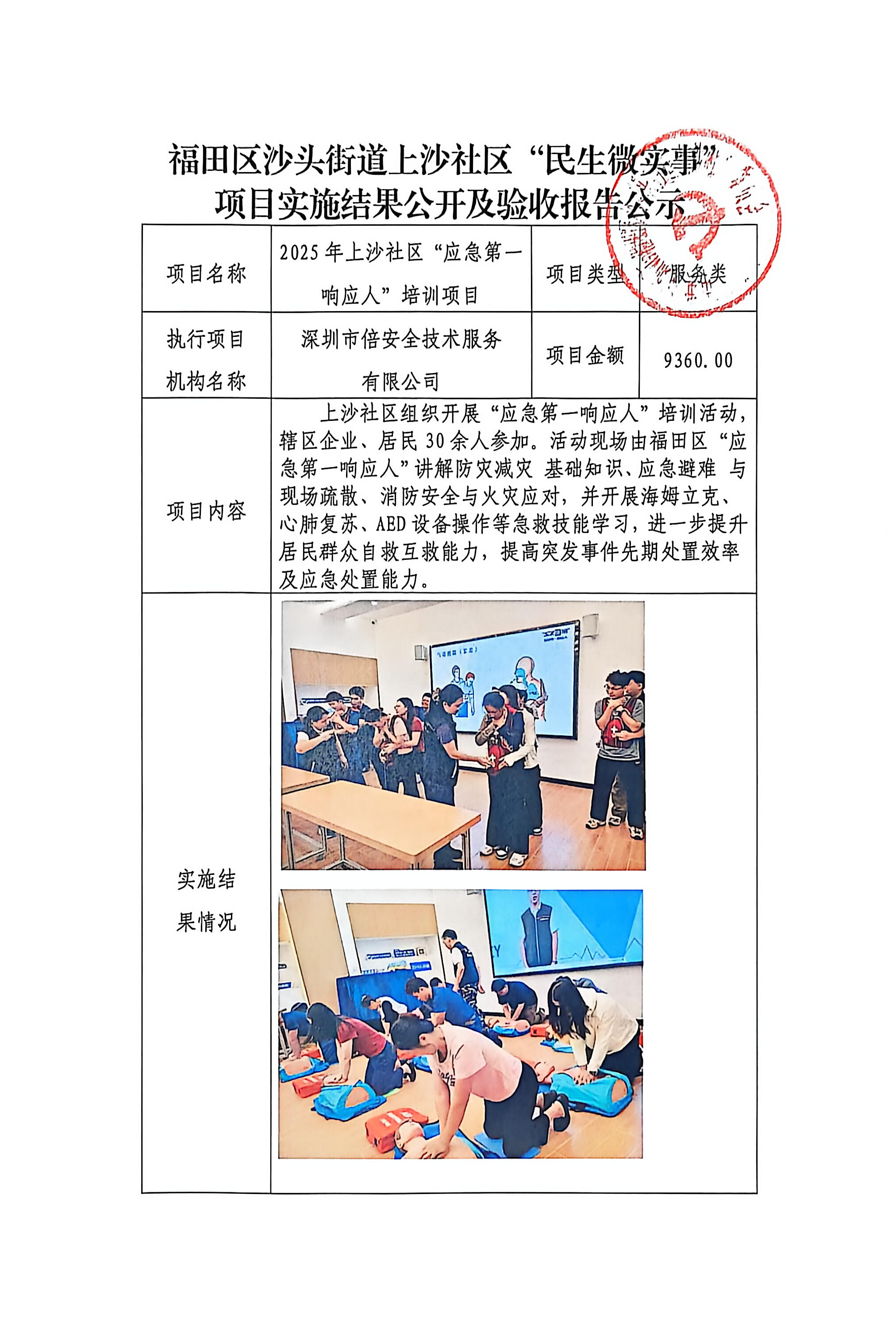 项目公示|福田区沙头街道上沙社区2025年上沙社区“应急第一响应人”培训项目“民生微实事”项目实施结果公开及验收报告公示