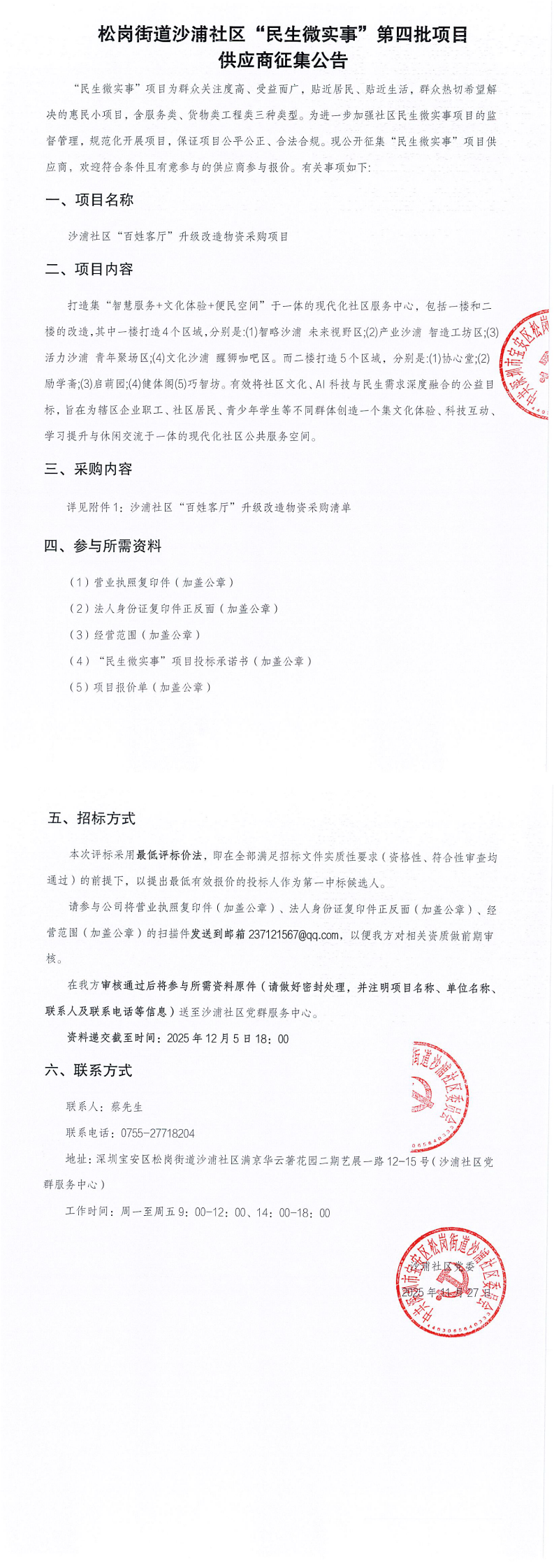 项目公示|宝安区松岗街道沙浦社区2025年“民生微实事”第四批项目供应商征集公告