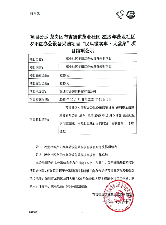 项目公示|龙岗区布吉街道茂业社区2025年茂业社区夕阳红办公设备采购项目“民生微实事·大盆菜”项目结项公示