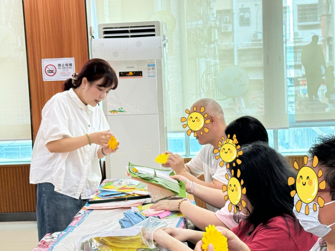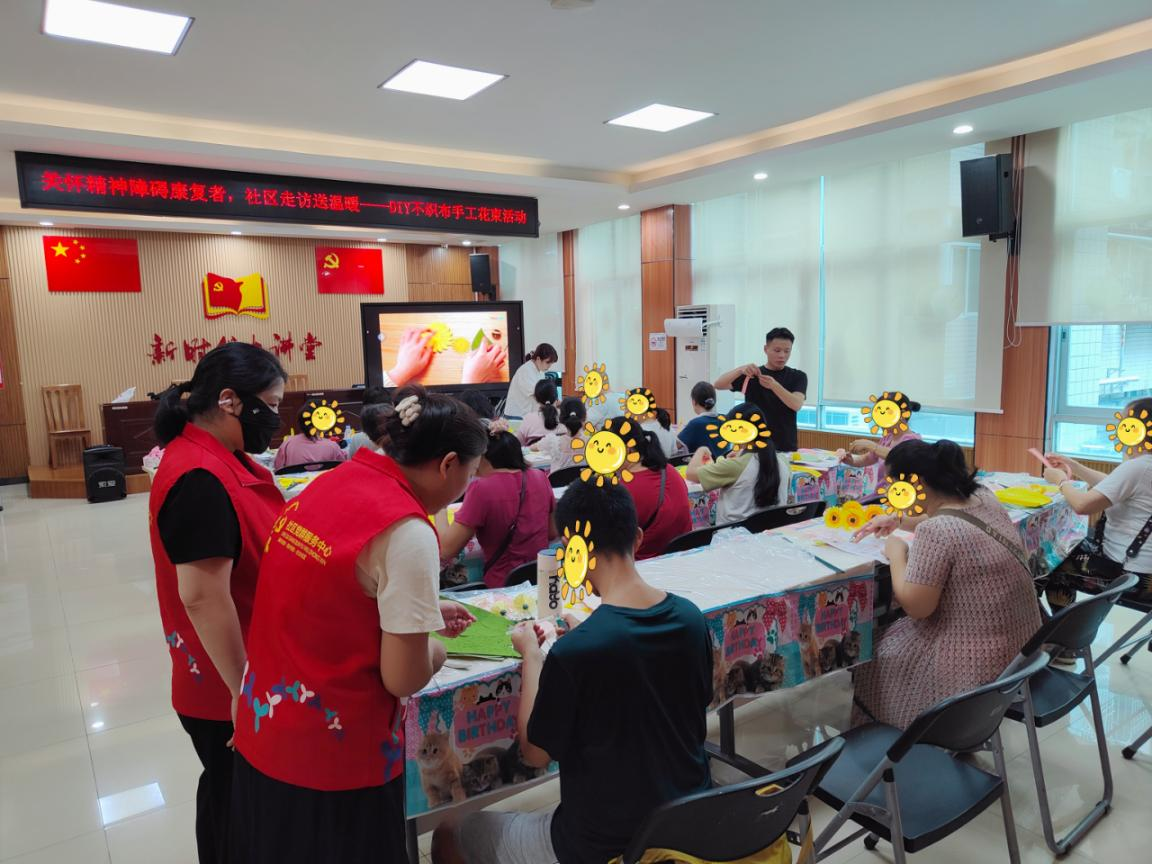 活动现场,在专业手工老师与精防工作人员的耐心引导下,学员逐步学习不织布花束的制作步骤。从认识材料、裁剪花瓣,到缠绕花枝、组合叶片,大家神情专注,认真聆听每一个细节讲解。不少学员眼中闪烁着跃跃欲试的光芒,彼此间轻声交流、互帮互助,现场氛围温馨而融洽。随着一朵朵向日葵、玫瑰与康乃馨在指尖绽放,学员们的脸上也浮现出满足的笑容。一位康复者欣喜地展示自己的作品,激动地说:“没想到我也能亲手做出这么漂亮的花,特别有成就感,心情都变得轻松了!”“感谢社区组织这样有意义的活动,看到他们专注而开心的样子,我们心里也倍感欣慰。”家属们亦深受感动。