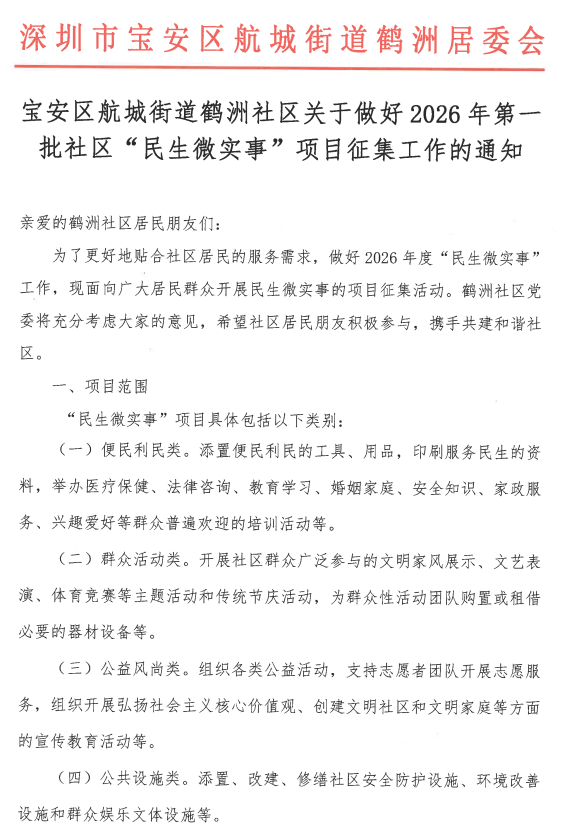 项目公示|宝安区航城街道鹤洲社区关于做好2026年第一批社区“民生微实事”项目需求征集工作的通知