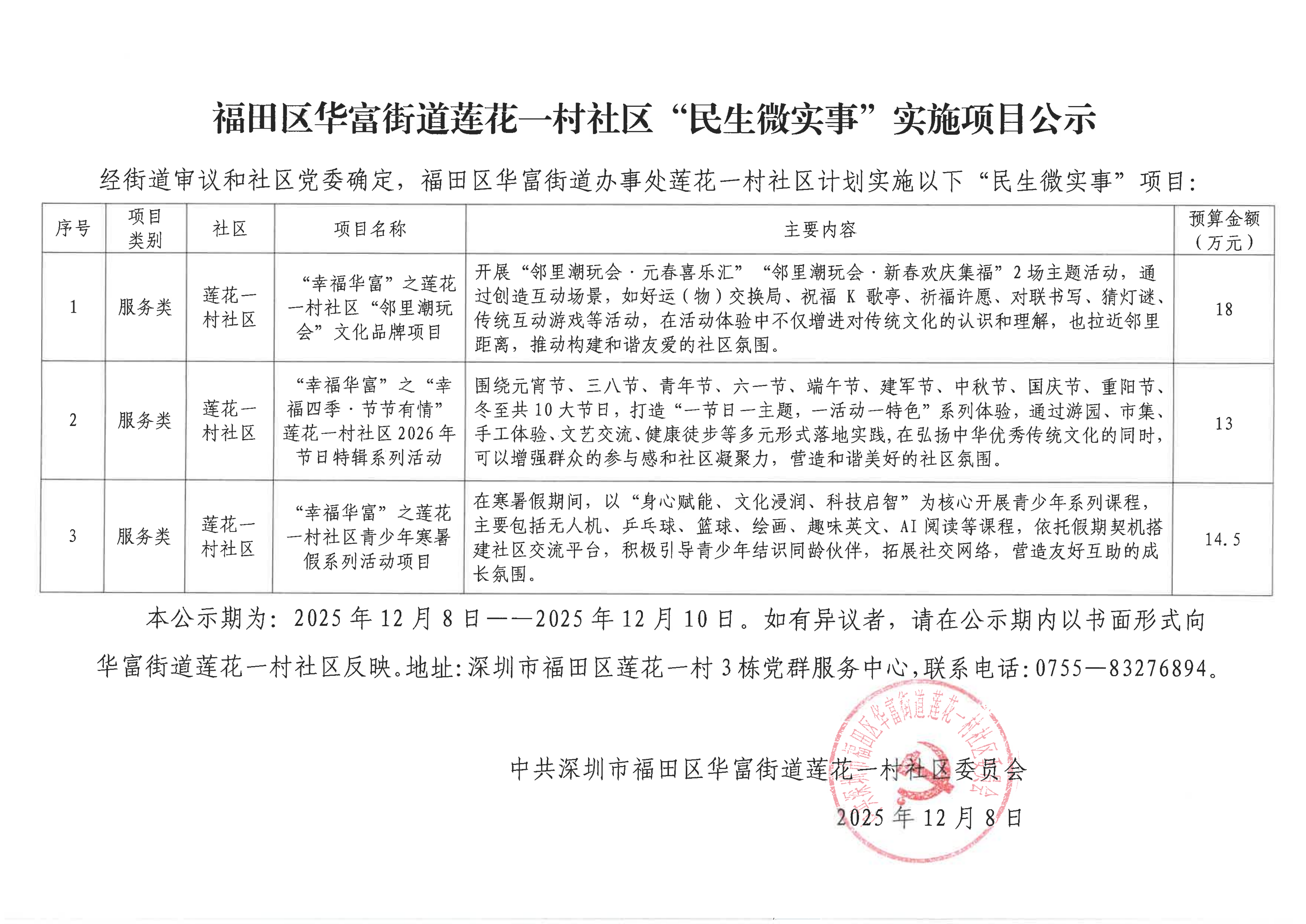 项目公示|福田区华富街道莲花一村社区“民生微实事”项目计划实施项目公示