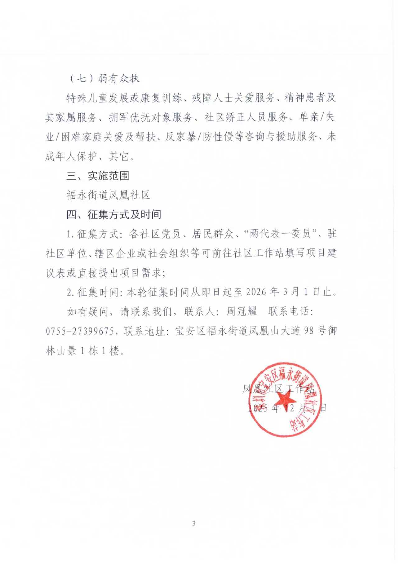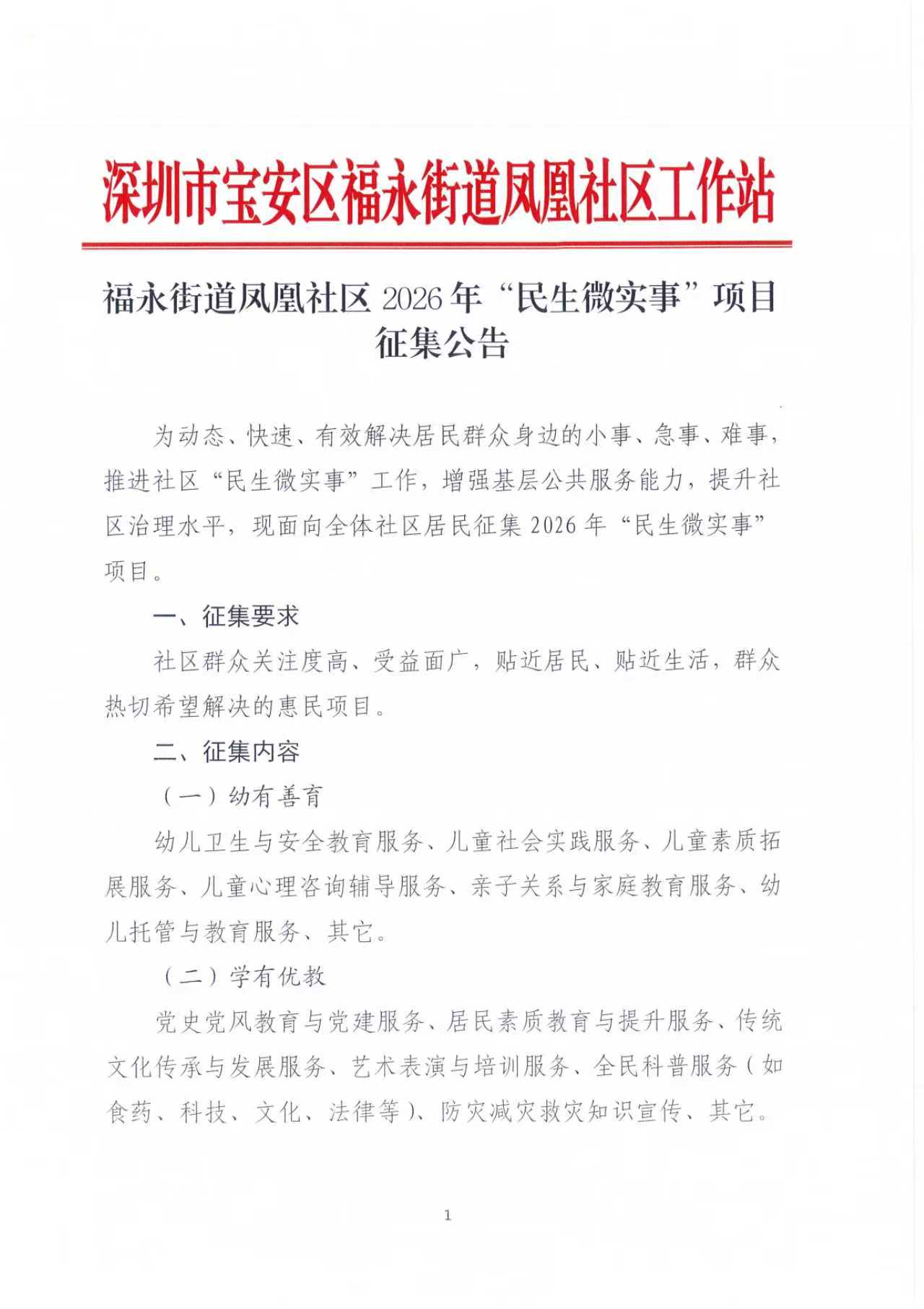 项目公示|宝安区福永街道凤凰社区2026年“民生微实事”项目征集公告