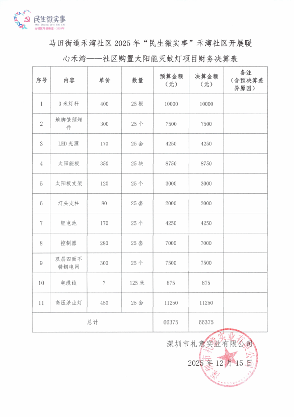 项目公示|光明区马田街道禾湾社区2025年“民生微实事”禾湾社区开展暖心禾湾——社区购置太阳能灭蚊灯项目财务决算表