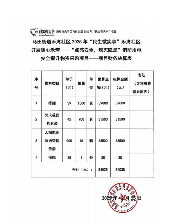 项目公示|光明区马田街道禾湾社区2025年“民生微实事”禾湾社区开展暖心禾湾——“点亮安全,熄灭隐患”消防用电安全提升物资采购项目——项目财务决算表