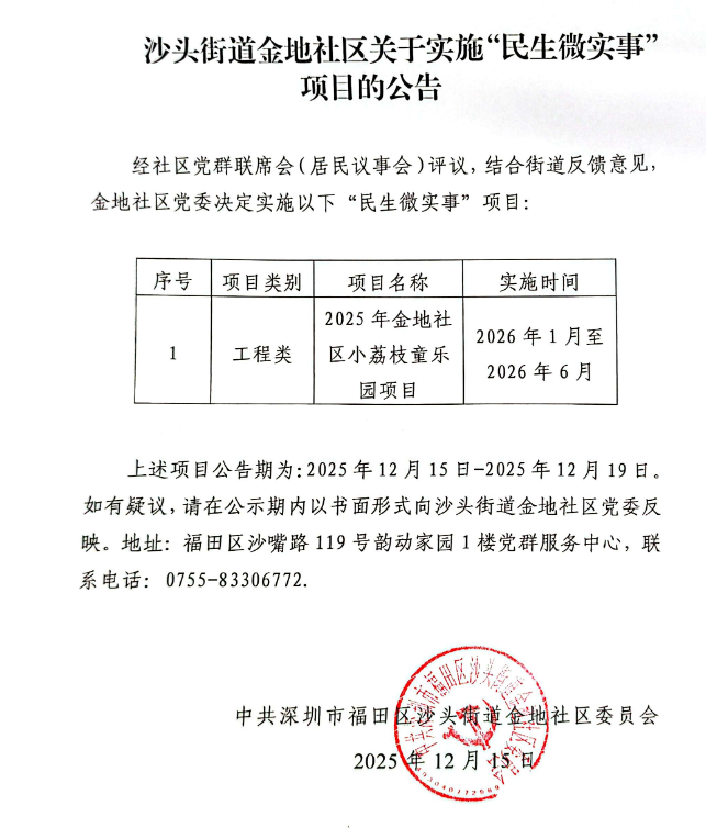 项目公示|福田区沙头街道金地社区2025年“民生微实事”项目的公告