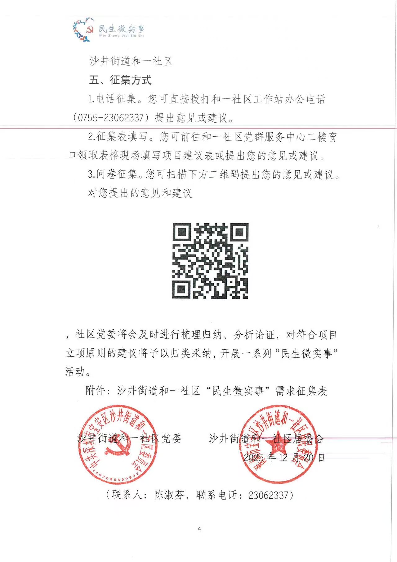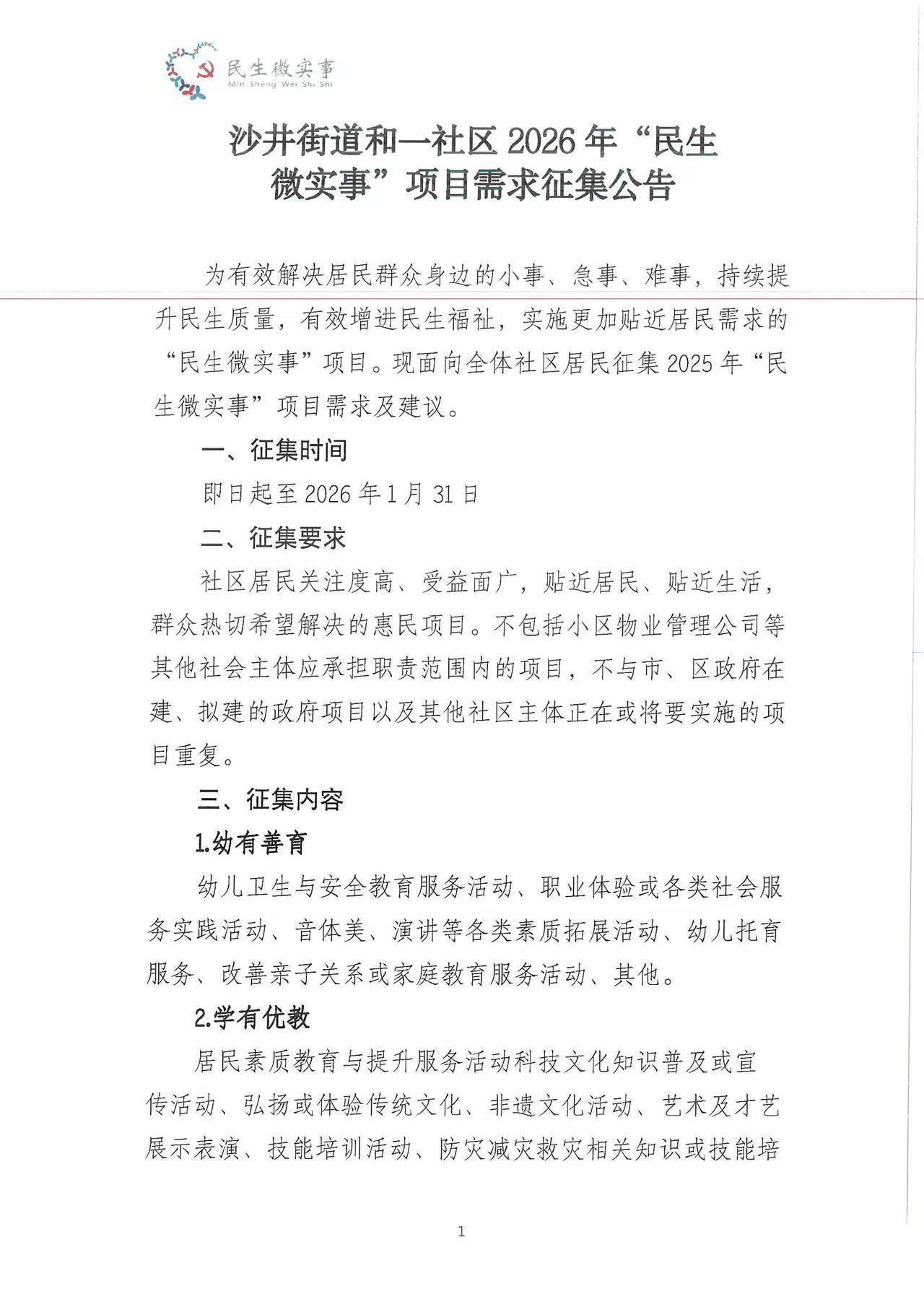 项目公示|宝安区沙井街道和一社区2026年“民生微实事”项目需求征集公告 (2026年1月)