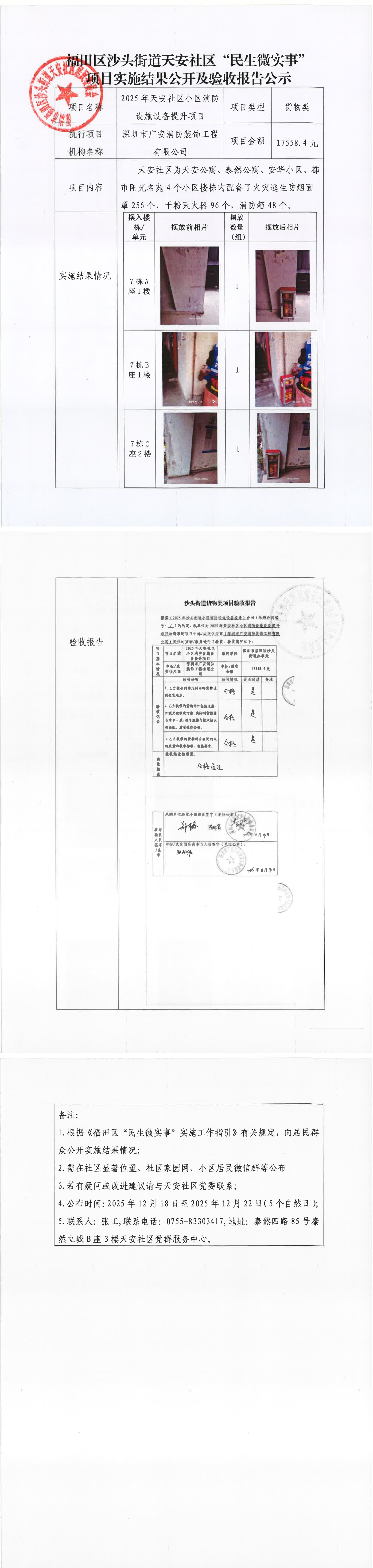 项目公示|福田区沙头街道天安社区2025年天安社区小区消防设施设备提升项目“民生微实事”项目实施结果公开及验收报告公示