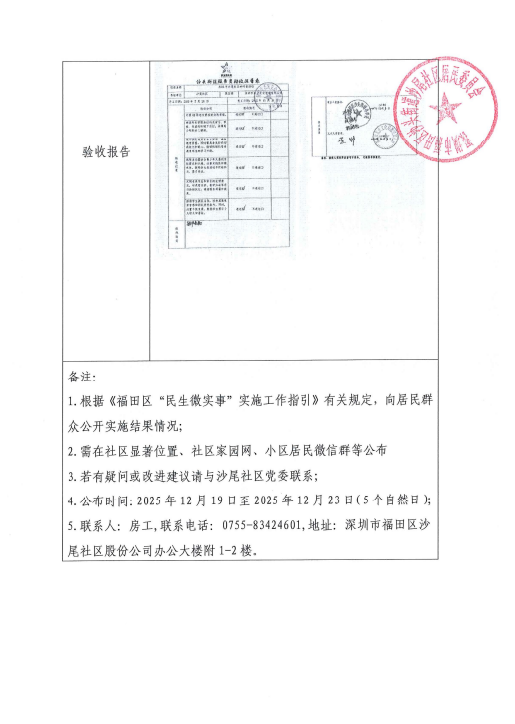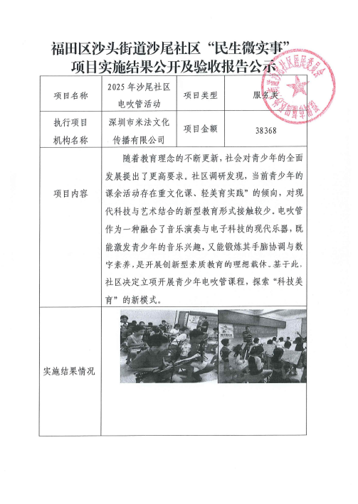 项目公示|福田区沙头街道沙尾社区2025年电吹管活动“民生微实事”项目实施结果公开及验收报告公示