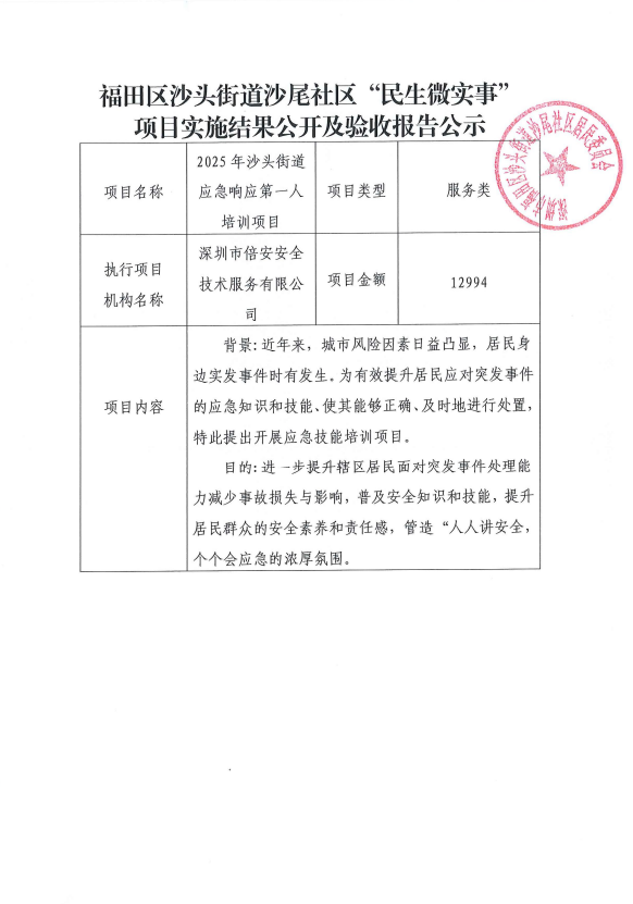 项目公示|福田区沙头街道沙尾社区2025年应急响应第一人培训项目“民生微实事”项目实施结果公开及验收报告公示